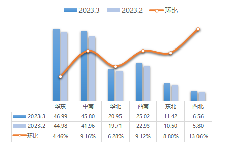 2023年3月,全国六大区环比2月均有不同程度的增长。交易规模最大的华东地区环比增长了4.46%,二手车交易量为44.99万辆,增加了2.01万辆,本月上海的增速最为明显,环比增长了21.1%,浙江、福建两省也有小幅的增长,分别增长了6.5%和5.8%。