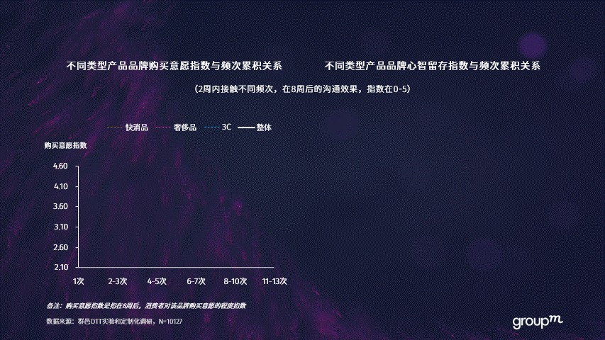两周内8次以上投放有显著的购买意愿提升,品牌心智留存需要长时间积累