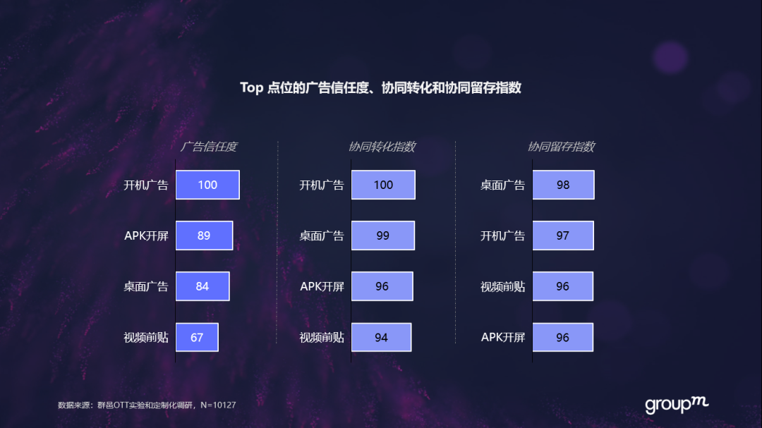当品牌客户希望通过OTT提高影响力,协同后链路效果时,资源流量、广告喜好度和印象度对消费者的影响力变弱,更为重要的是消费者对广告的可信程度以及协同转化和留存的沟通效果。这三者的结合能够有效反映出OTT大屏对消费者在后链路转化上的影响。OTT资源选择中,开机广告、桌面广告、APK开屏及视频前贴这类处于消费者观看路径中的核心点位资源更能影响消费者的深层次心智。