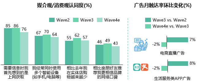 在疫情优化期间,由于交通出行受限,消费者的媒介使用和消费行为趋向于数字化和线上化。因此,他们更倾向于通过线上渠道获取信息、购物和评估产品和服务的口碑,这些趋势在不同程度上得到了提升。然而,随着疫情管控措施逐步放宽,线下购物和社交活动也开始逐步恢复,在信息获取和口碑评估方面,消费者也开始向线下回归。此外,电商直播和生活服务APP的使用率和广告接触比例也开始回落。