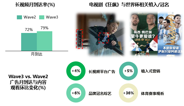 在防疫优化期间,消费者由于居家时间增加,更多地通过互联网和视频平台获取信息和娱乐内容。此外,世界杯在这一时期的举办也使得体育赛事内容观看环比增长明显。这一趋势促使消费者长视频触达率、平台广告、剧综内容消费以及相关植入和冠名广告感知量的增加。品牌营销方面,消费者在这期间通过广告、植入和冠名等形式对品牌的认知与互动得以增强。