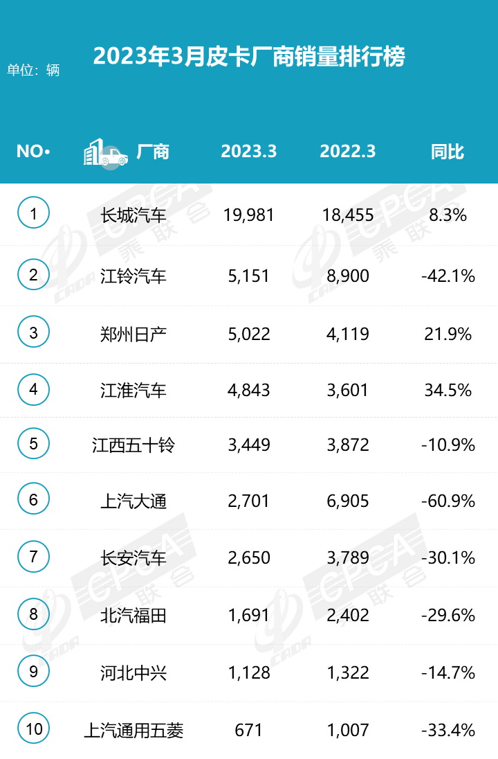 3月皮卡厂家销量排名特征是国内外市场销量的共同贡献结果。长城汽车保持强势皮卡领军地位,部分皮卡企业抓住出口机遇实现强势增量,如长城皮卡、江淮汽车、上汽大通、福田汽车等的出口走势较强,出口占部分厂家总量超30%。国内零售市场的主力厂家皮卡走势仍是较稳,江铃汽车和郑州日产走势很好,长城、江铃、郑州日产、江西五十铃的皮卡一超三强格局相对稳定。在3月皮卡走势相对平稳的良好起步下,2023年的皮卡市场仍将会恢复增长。
