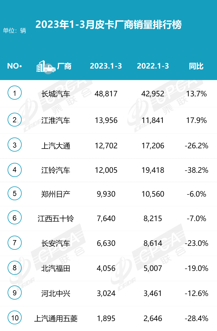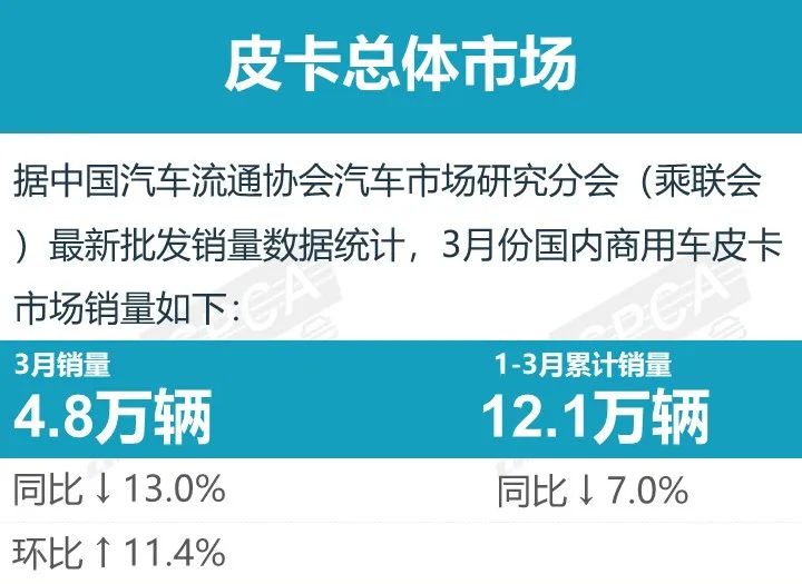 根据乘联会皮卡市场信息联席会数据, 2023年3月份皮卡市场销售4.8万辆,同比下降13%,处于近5年来月度的低位水平,3月环比增11.4%,增幅较小。今年3月的皮卡生产同比下降7%,皮卡出口0.72万辆,同比下降29.2%。国内市场较稳,尤其是县乡市场的皮卡销量占比同比去年增长较平稳,有效地抵冲了大城市的皮卡萎缩。2023年1-3月的总体皮卡销量12.1万辆,同比增速下降7%,走势相对较平稳,皮卡产销表现还是很好的。