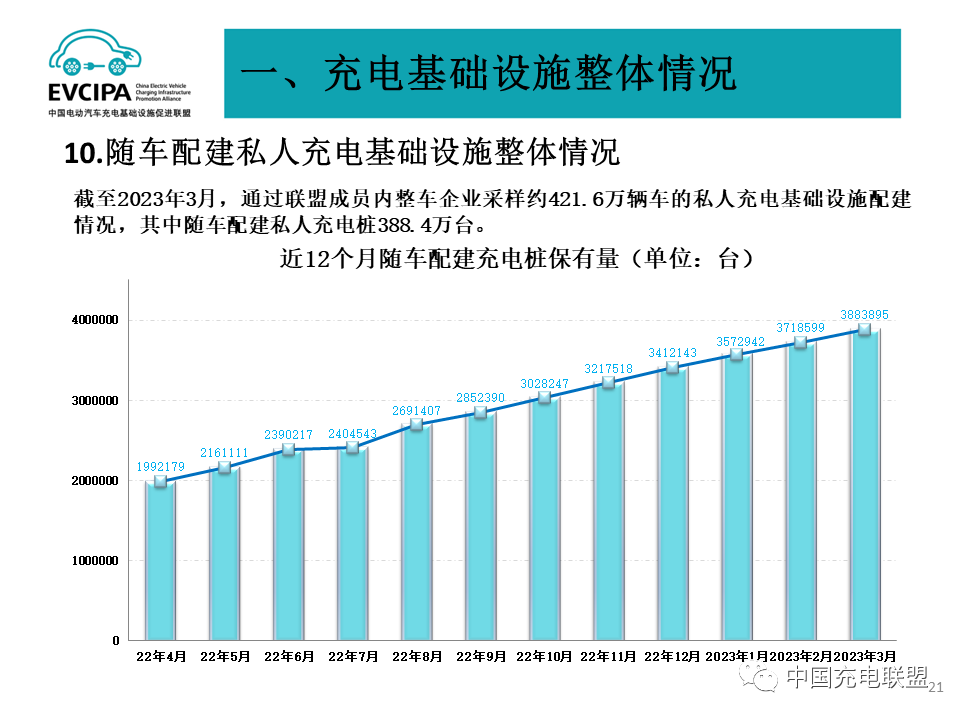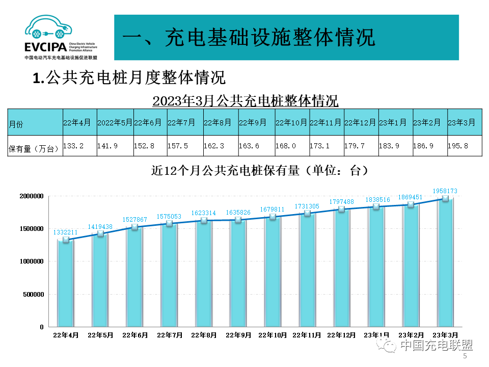 1、公共充电基础设施运行情况,2023年3月比2月公共充电桩增加8.9万台,3月同比增长59.0%。截至2023年3月,联盟内成员单位总计上报公共充电桩195.8万台,其中直流充电桩82.2万台、交流充电桩113.6万台。从2022年4月到2023年3月,月均新增公共充电桩约6.1万台。