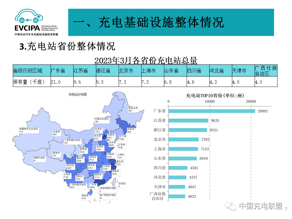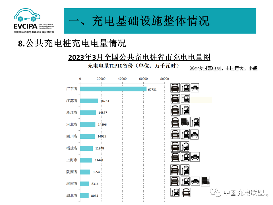 2、公共充电基础设施省、区、市运行情况,广东、浙江、江苏、上海、北京、湖北、山东、安徽、河南、福建TOP10地区建设的公共充电桩占比达71.2%。全国充电电量主要集中在广东、江苏、浙江、河北、四川、福建、上海、陕西、河南、湖北等省份,电量流向以公交车和乘用车为主,环卫物流车、出租车等其他类型车辆占比较小。2023年3月全国充电总电量约24.9亿度,较上月减少0.6亿度,同比增长130.6%,环比减少2.2%。