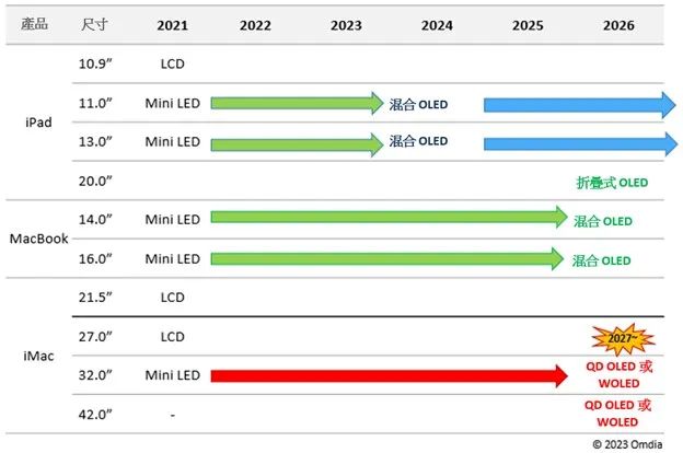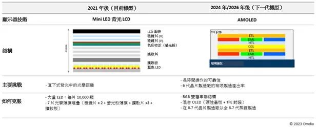 2023 年成长趋势预测的基础为逐渐成长的採用情况、高端领域增加的出货量,以及笔记型电脑品牌和 OEM 的持续推动。Omdia 预计苹果将在 2024 年为 iPad Pro 并在 2026 年为 MacBook Pro 从目前的 Mini LED 背光 LCD 转向混合 OLED 显示面板 (Hybrid OLED)。混合 OLED 显示器(Hybrid OLED)需要硬式玻璃背板基板,且具有薄膜的弹性封装。在苹果的转变下,OLED 渗透率将大幅成长。