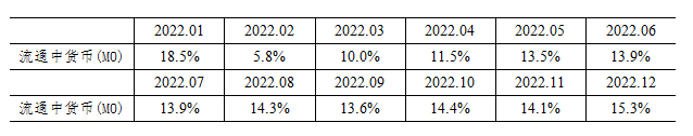 注4:自2022年12月起,“流通中货币(M0)”含流通中数字人民币。12月末流通中数字人民币余额为136.1亿元。修订后,2022年各月末M1、M2增速无明显变化。修订后M0增速如下: