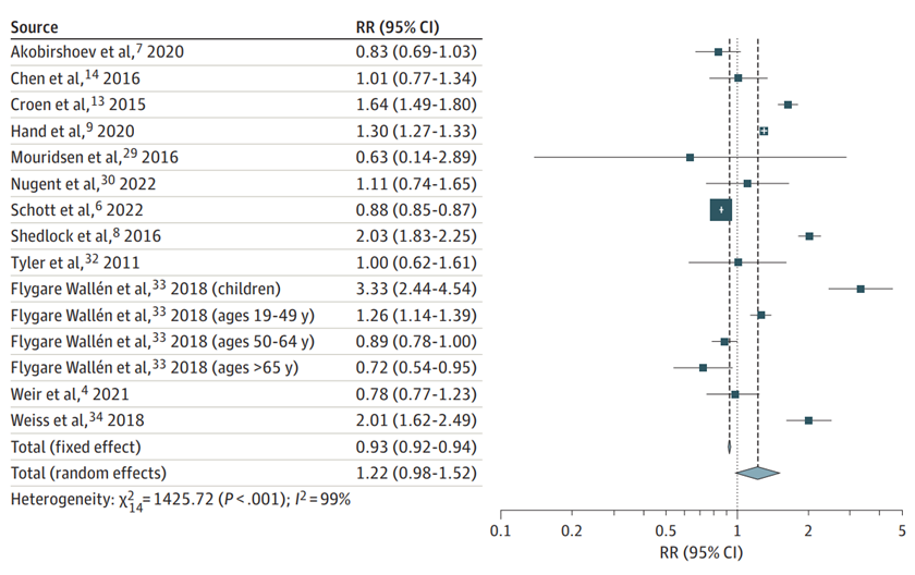 接着,研究者分析了自闭症与高血压发生风险之间的关联。该分析纳入了12项研究,包括237672名自闭症患者和3222718名非自闭症个体。分析结果表明,自闭症与高血压发生风险的显著增加无关。成年组和儿童组的分析表明,成年自闭症患者的高血压风险没有增加(RR,1.03;95% CI,0.85-1.26;P=0.75),而自闭症儿童的风险显著更高(RR,2.54;95% CI,1.56-4.12;P<0.001)。