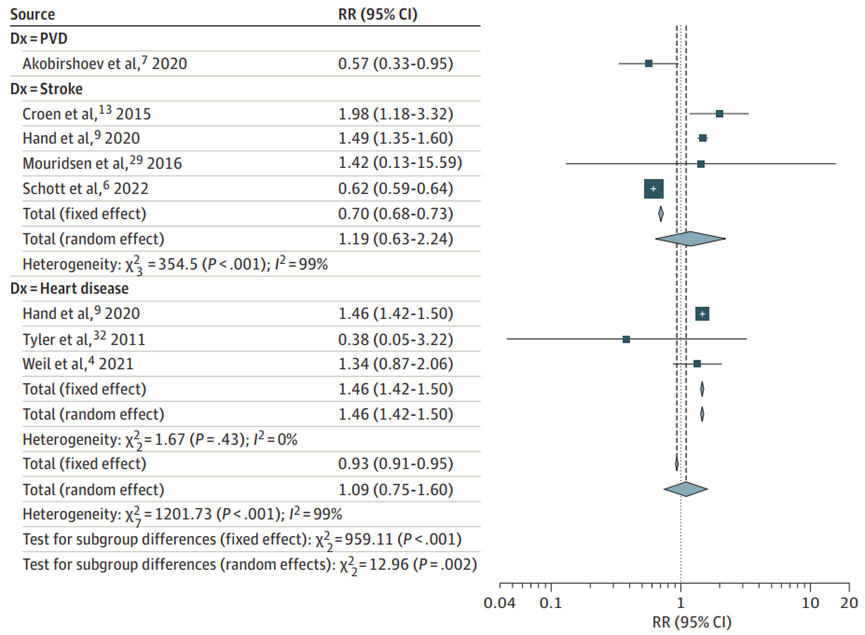 自闭症与大血管疾病发生风险的关联分析纳入了7项研究,包括163653名自闭症患者和531492名非自闭症个体。分析结果表明,自闭症与大血管疾病风险的显著增加无关(RR,1.09;95% CI,0.75-1.60;P=0.65)。小群体分析表明,自闭症显著增加心脏病的风险(RR,1.46;95% CI,1.42-1.50;P<0.001),而对中风发生风险没有显著影响(RR,1.19;95% CI,0.63-2.24;P=0.592)。