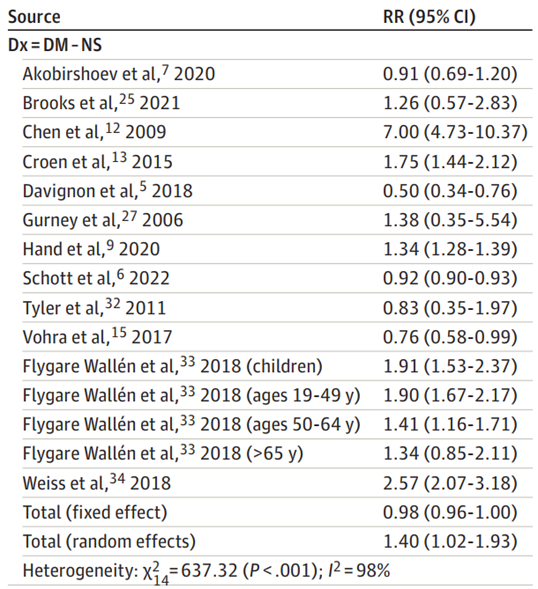 他们共对34项研究进行了评估,包括276173名自闭症患者和7733306名非自闭症患者(平均年龄为31.2岁;女性占比为47%)。荟萃分析结果表明,糖尿病在自闭症患者群体中的总体发生风险增加57.3%,其中1型糖尿病发生风险增加64.1%,2型糖尿病发生风险增加146.7%;血脂异常和心脏病发生风险分别增加69.4%和45.9%。元回归分析结果显示,与非自闭症儿童相比,自闭症儿童发生糖尿病和高血压的风险分别增加184.2%和153.7%。