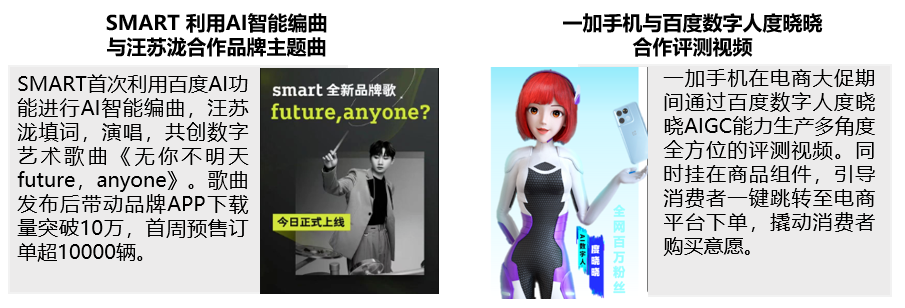 在国内,百度曾在2022年对外宣布,百度AIGC单条创意制作的时间从30分钟缩短到4分钟,每天可以生产14亿条创意内容,而且创作能力已经从文本拓展到了图片和视频。从百度AIGC营销矩阵来看,汽车、3C品牌已经通过AIGC技术进行营销活动。