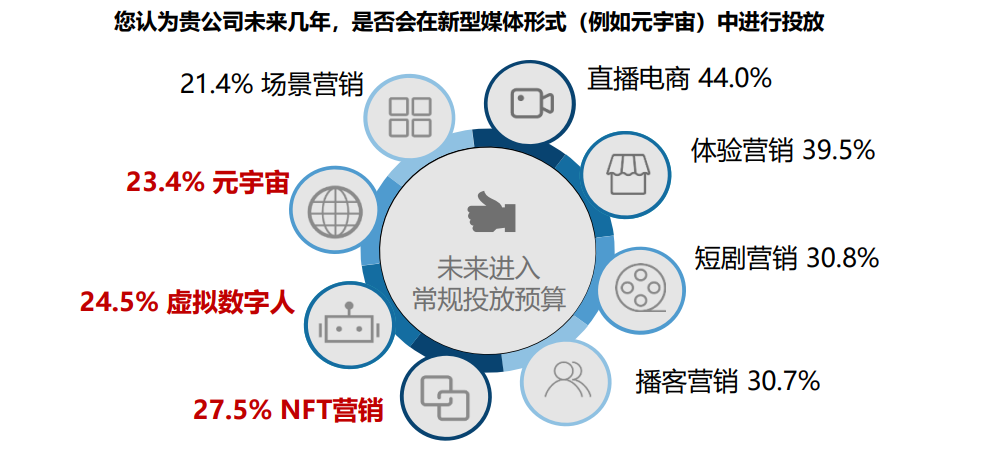 - NFT、数字人、元宇宙等先进技术化营销方式也是品牌进入未来常规投放的趋势之一