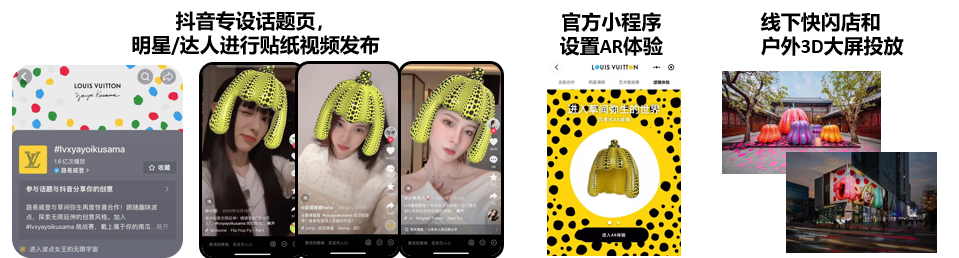 LV和草间弥生联合新品发布在官方小程序和抖音同步定制“波点南瓜帽”AR贴纸,在抖音上发起艺术家联名话题#lvxyayoikusama,邀请用户共同参与。上线后邀请多位明星、达人参与挑战赛,使用创意贴纸示范。贴纸话题上线一周,其话题量达1.4亿,参与视频数11.7万,话题互动量500万。