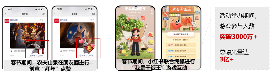 - 品牌通过H5互动营销方式扩大曝光量,提升消费者对品牌的好感度和认同感:农夫山泉通过朋友圈广告进行春节创意互动,通过H5互动形式有效扩大品牌曝光量,增强消费者与平台间的粘性,有助于实现品牌和消费者之间的双向互动,无形中提升消费者对品牌的好感度和认同感。