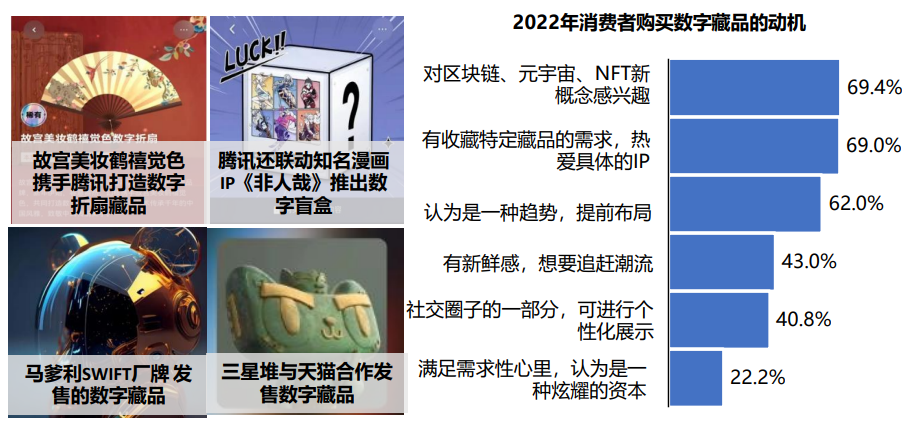 随着元宇宙概念炙手可热,伴随出现的对虚拟事物的数字化、货币化的数字藏品在过去一年里受到品牌主的广泛关注。奢侈品、文创IP等纷纷发售数字藏品,短时间内即全部售罄。根据艾瑞《中国数字藏品行业研究报告》中可以发现,消费者购买数字藏品的最主要动机是对新概念感兴趣和有喜欢的IP。品牌发售数字藏品正式迎合消费者的喜好,激发消费者参与活动的积极性,尤其是文创IP从一定程度上减弱艺术品的沉闷感,赋予艺术品生命力,进一步刺激消费者与品牌的互动性。