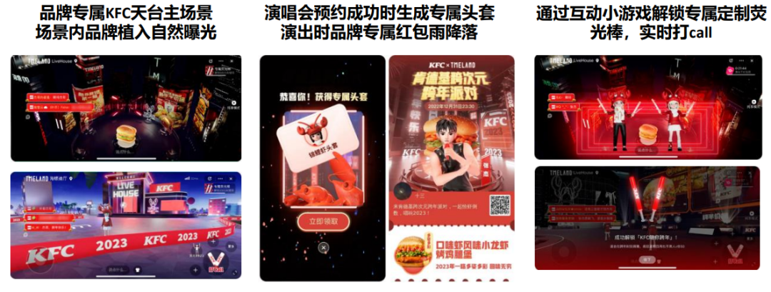 - 虚拟世界建立品牌与消费者的沟通,拉近彼此间的距离,重塑品牌形象:肯德基携手TMELAND打造次元跨年派对充分撬动年轻消费者的注意力。利用先进技术重塑自身品牌形象,进一步扩大品牌影响力。