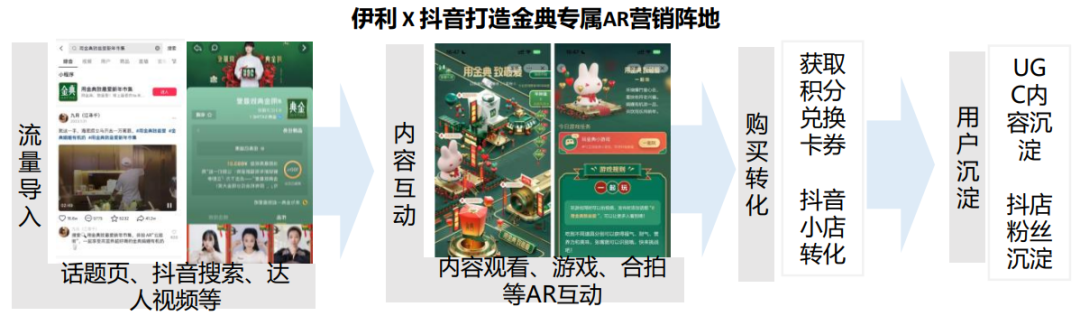 - 沉浸式体验加以内容辅助赋能多元场景,进一步增强消费者粘性,有效实现转化与用户沉淀:伊利与抖音合作打造的AR新年集市通过游戏化的沉浸式体验让消费者融入其中,对品牌更易产生信赖感,有助于实现用户沉淀。全链路营销模式实现消费者从“体验–分享–购买”的互动闭环,从而引流消费者至详情页、加购,实现营销效果的直接转化。