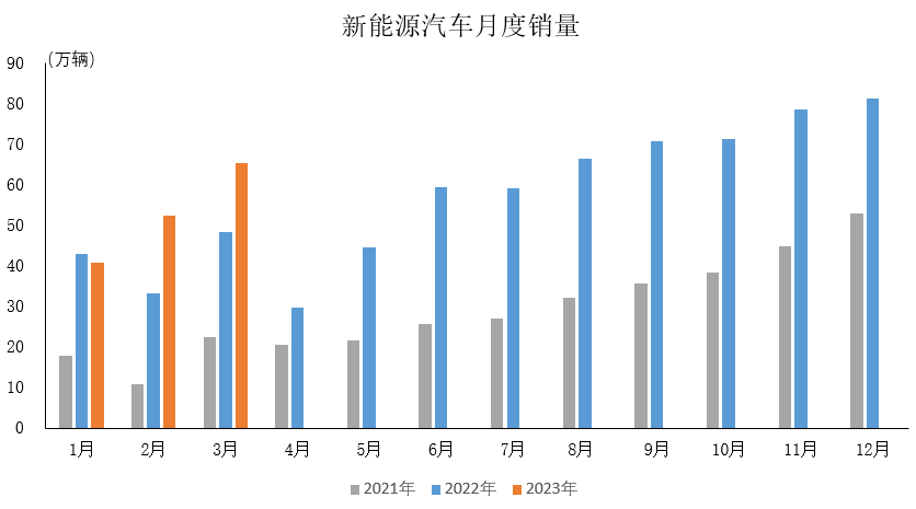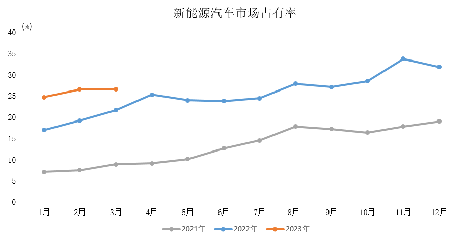 2023年3月,新能源汽车产销分别完成67.4万辆和65.3万辆,环比分别增长22%和24.4%,同比分别增长44.8%和34.8%,市场占有率达到26.6%。