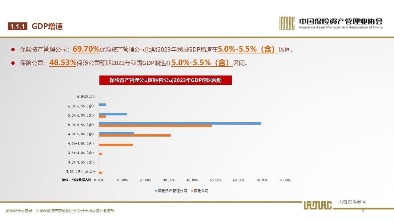 此次共有100余家保险机构参与调查,包括33家保险资管公司和近70家大型保险公司。整体来看,75.76%的保险资管公司和72.06%的保险公司对今年宏观经济持较乐观的看法。69.7%的保险资管公司和48.53%的保险公司预计,2023年我国国内生产总值增速在5%至5.5%(含)区间。针对居民消费价格指数走势,多数调查对象选择了“先降后升”“保持平稳”以及“整体呈上升”的选项;对于生产者价格指数走势,69.7%的保险资管公司和44.12%的保险公司判断为“先降后升”。