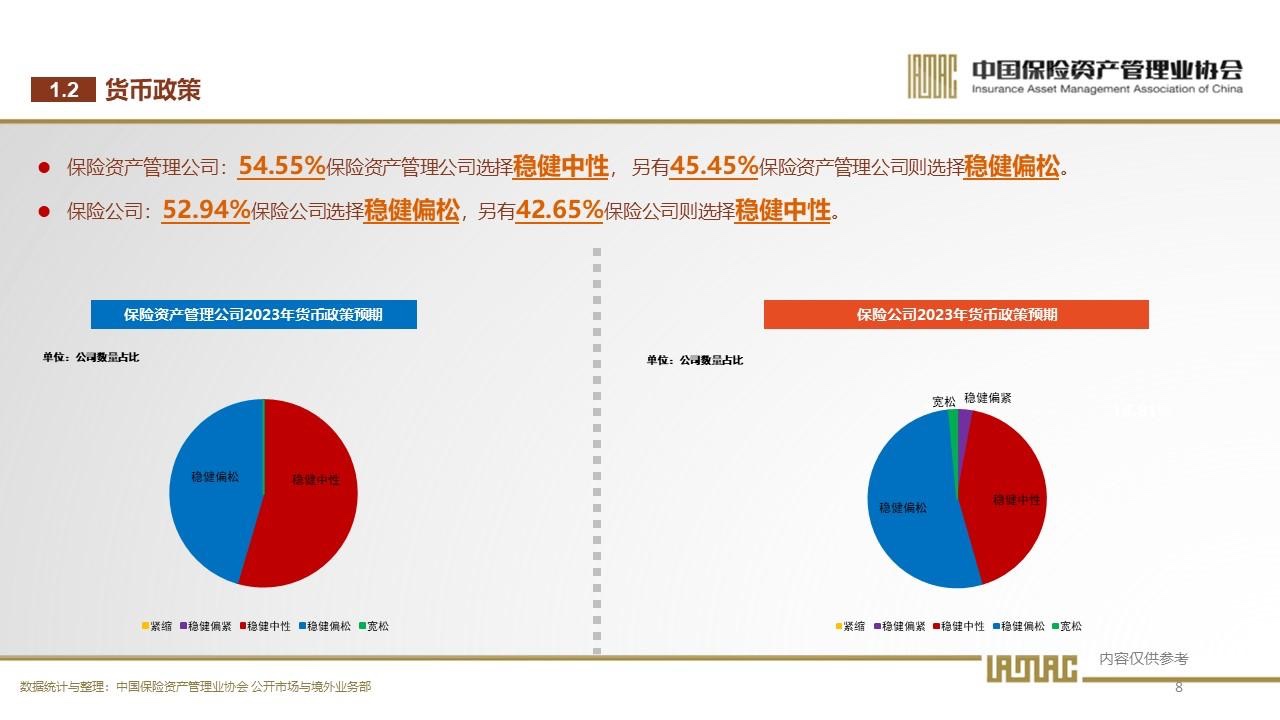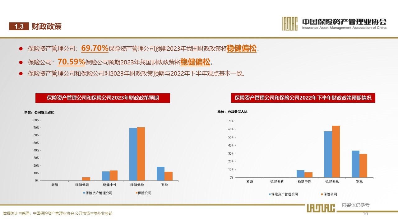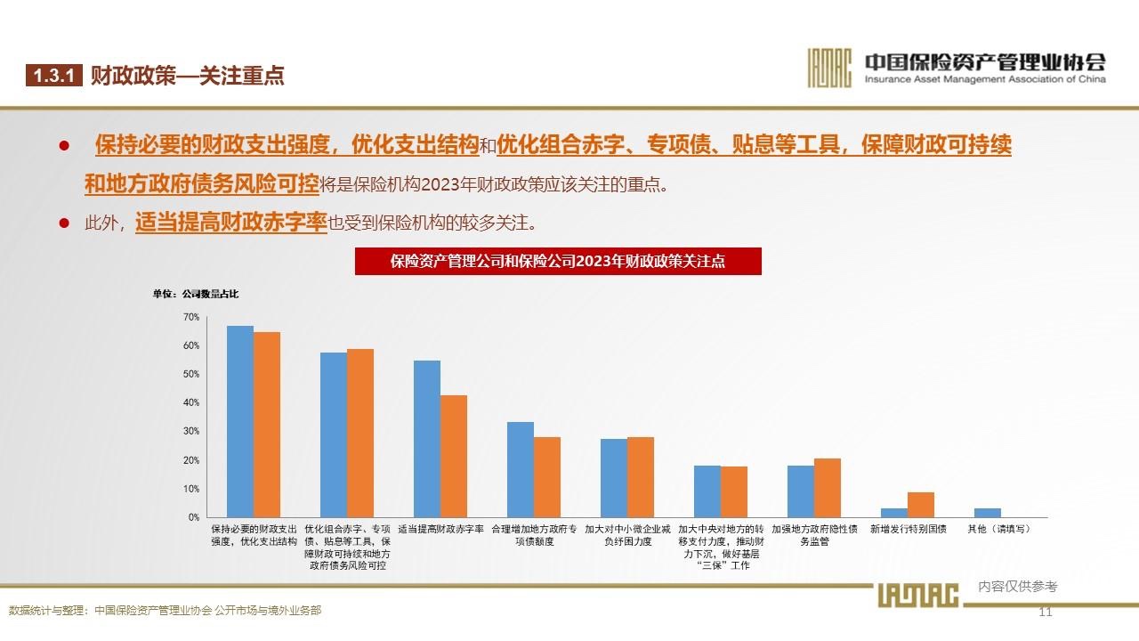 财政政策方面,70%左右的受访机构预测2023年我国财政政策将“稳健偏松”,这一预期与2022年下半年观点基本一致。保持必要的财政支出强度,优化支出结构;优化组合赤字、专项债、贴息等工具,保障财政可持续和地方政府债务风险可控以及适当提高财政赤字率,将是保险机构今年对财政政策的关注重点。