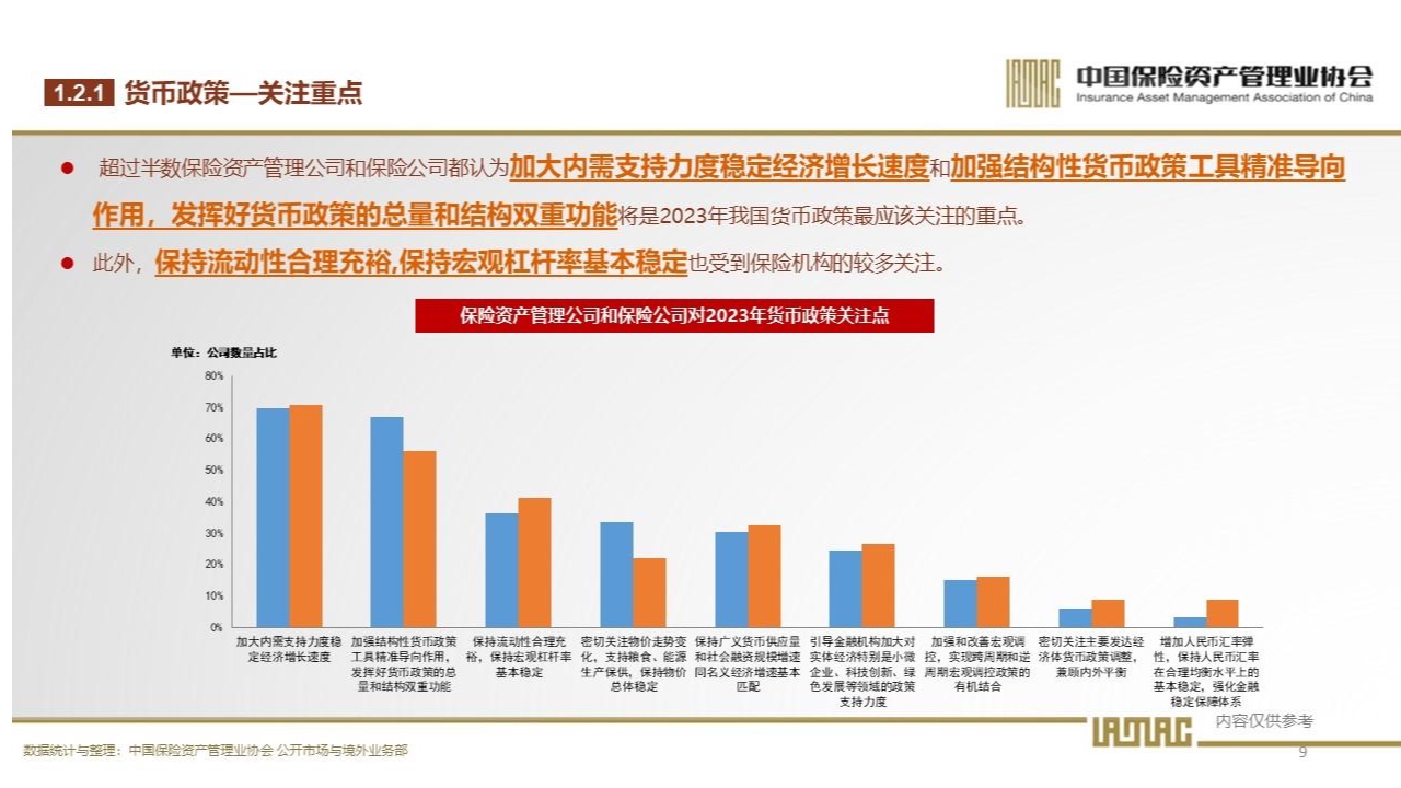 货币政策方面,“稳健偏松”和“稳健中性”是大部分调查对象的预期。超过半数的保险资管公司和保险公司都认为,加大内需支持力度稳定经济增长速度和加强结构性货币政策工具精准导向作用,发挥好货币政策的总量和结构双重功能,将是2023年我国货币政策最应该关注的重点。此外,保持流动性合理充裕,保持宏观杠杆率基本稳定也受到保险机构的较多关注。