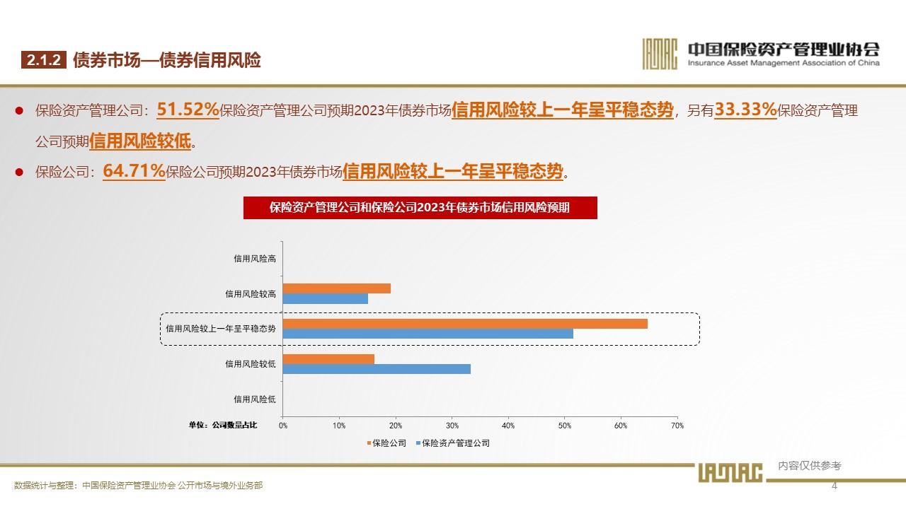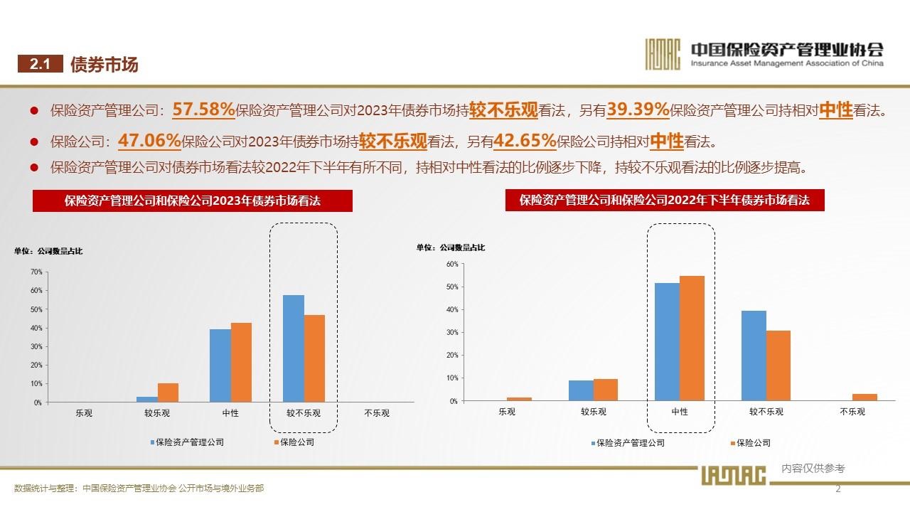 债券市场方面,约50%的保险机构对2023年债券市场持较不乐观的看法,另有约40%的保险机构持相对中性看法。与2022年下半年不同,保险资管公司对债券市场持中性看法的比例逐步下降,而认为发展较不乐观的比例逐步提高。