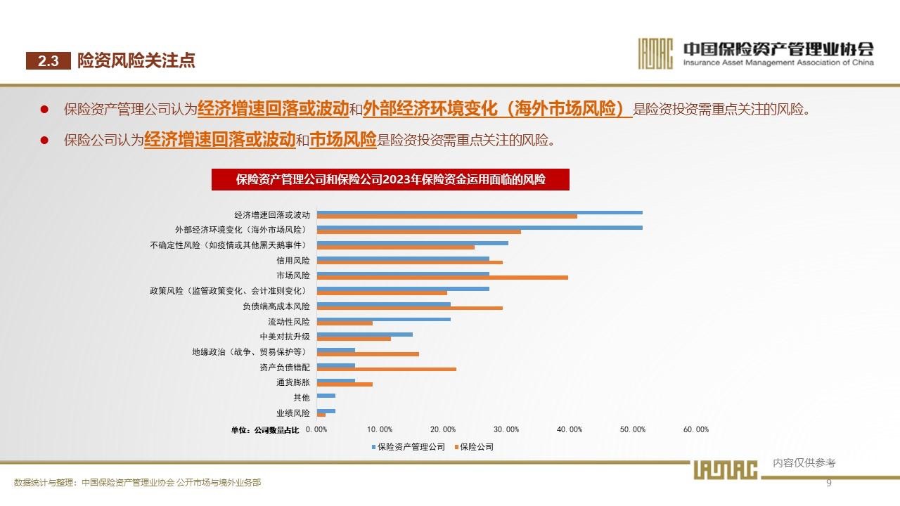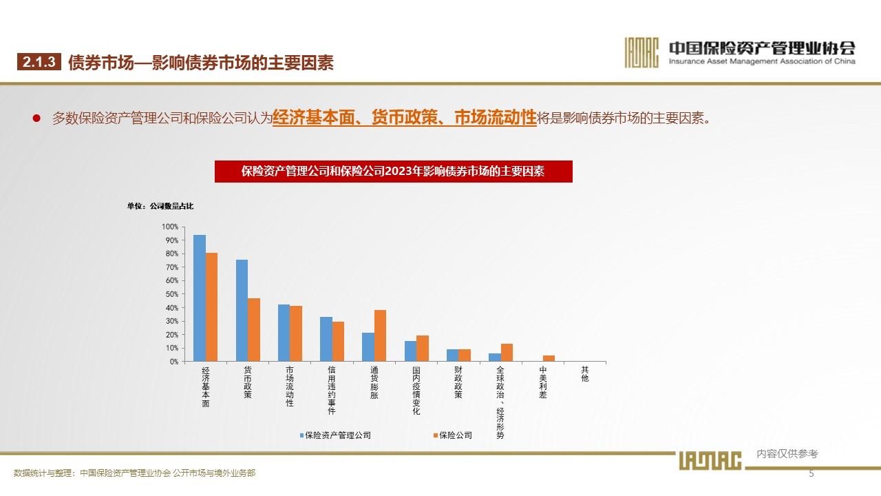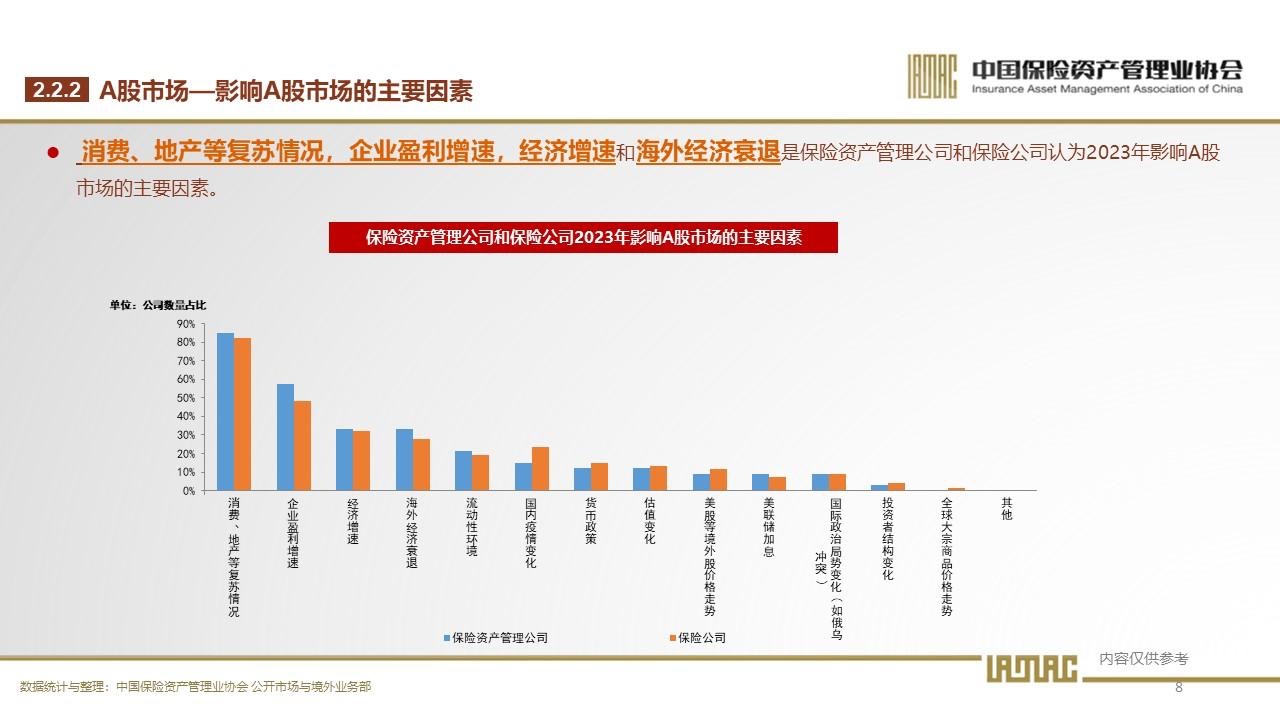 具体来看,估值方面,81.82%的保险资管公司和73.53%的保险公司认为当前A股估值较低,另有15.15%的保险资管公司和22.06%的保险公司认为当前估值基本合理。受访机构认为,消费、地产等行业的复苏、企业盈利增速和经济增速以及海外经济衰退,是今年影响A股市场的主要因素。