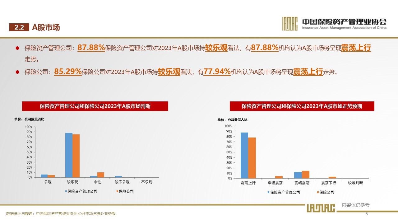 中国保险资产管理业协会近日公布的2023年第1期保险资产管理业投资者信心调查结果显示,绝大多数保险机构对今年A股市场表现持乐观看法。