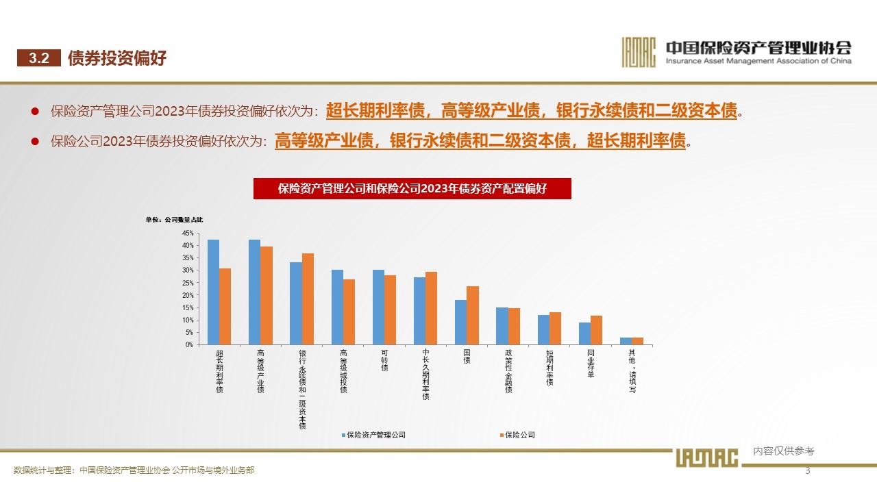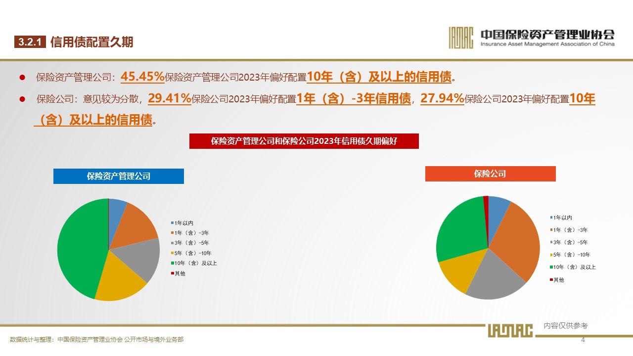 从投资偏好来看,债券市场方面,超长期利率债、高等级产业债、银行永续债和二级资本债是保险机构今年重点投资方向。45.45%的保险资管公司和27.94%的保险公司偏好配置10年(含)及以上信用债,另有近30%的保险公司偏好配置1年(含)至3年信用债。