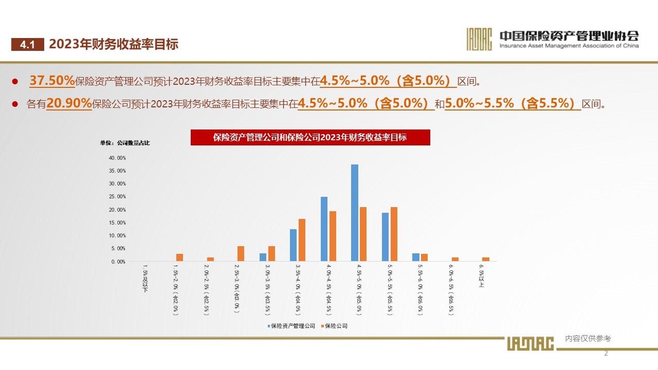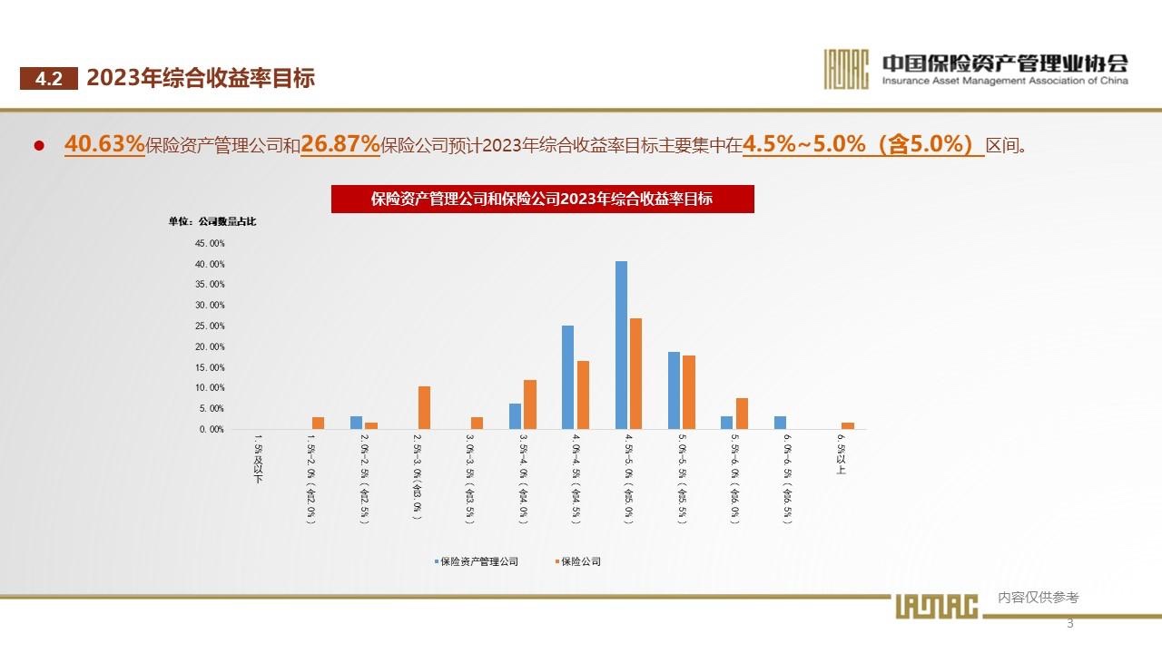总的来看,保险机构对2023年资本市场较为看好,财务收益率和综合收益率目标集中于4%至5.5%,整体投资风格较为稳健。