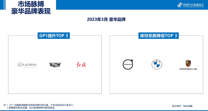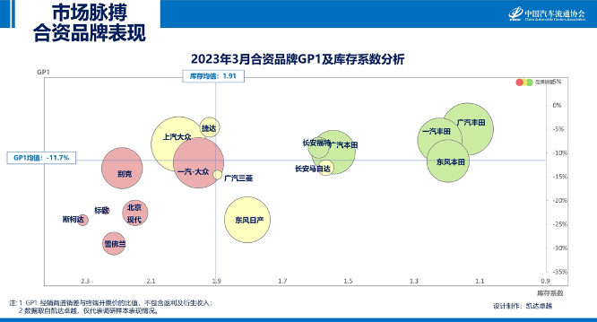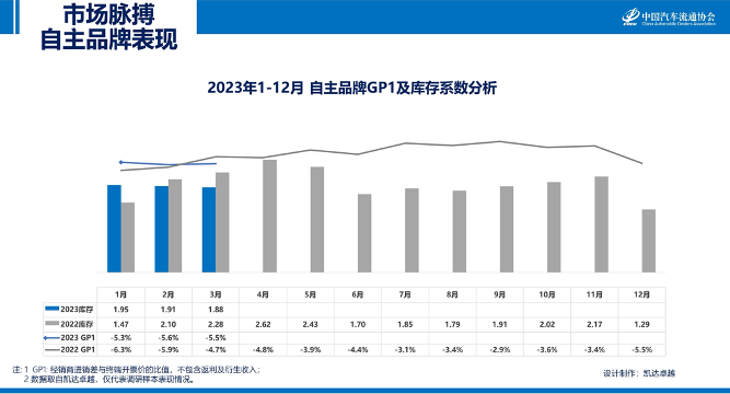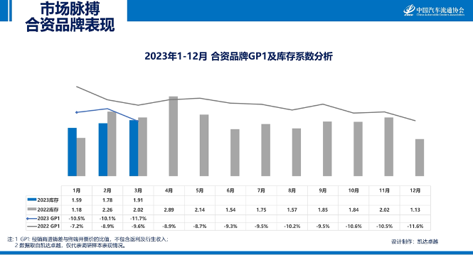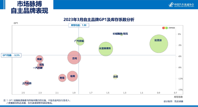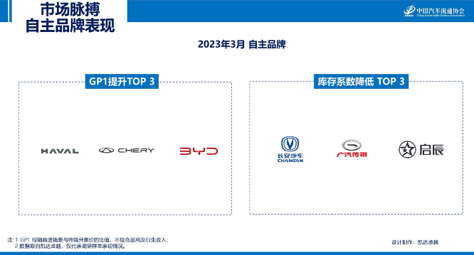 2023年3月, 库存系数下降的前三个品牌为:长安乘用车、传祺、启辰;GP1提升的前三个品牌为:哈弗、奇瑞、比亚迪。