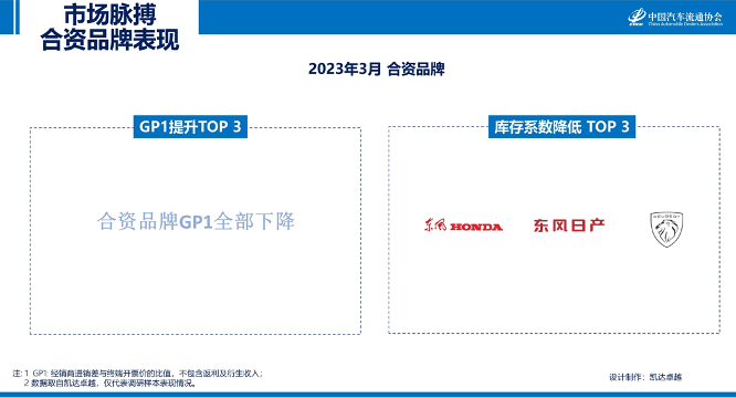 本月所有合资品牌GP1全部下降;库存系数降低排名前三的品牌是:东风本田、东风日产、标致。