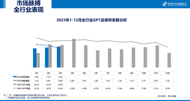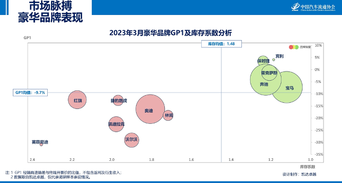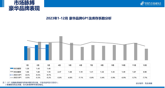 2023年3月,豪华品牌库存系数上升至1.48;GP1指标为-9.7%,与上月相比小幅下降。