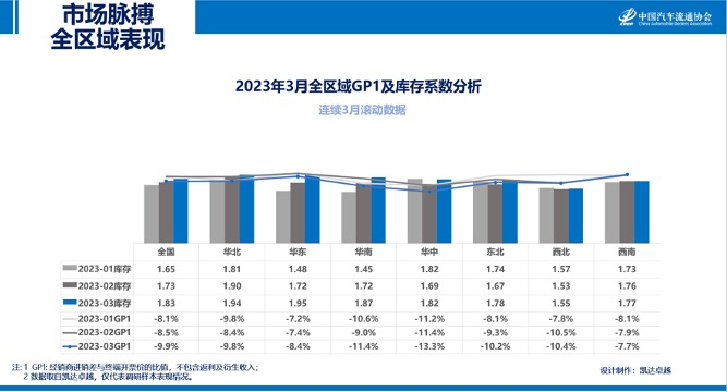 2023年3月,汽车终端销售价格下探,订单转化率低,消费者观望情绪重,市场整体需求偏弱。全国各区域库存出现小幅上涨。分区域来看,华中区域GP1最低,华东区域的库存系数最高。