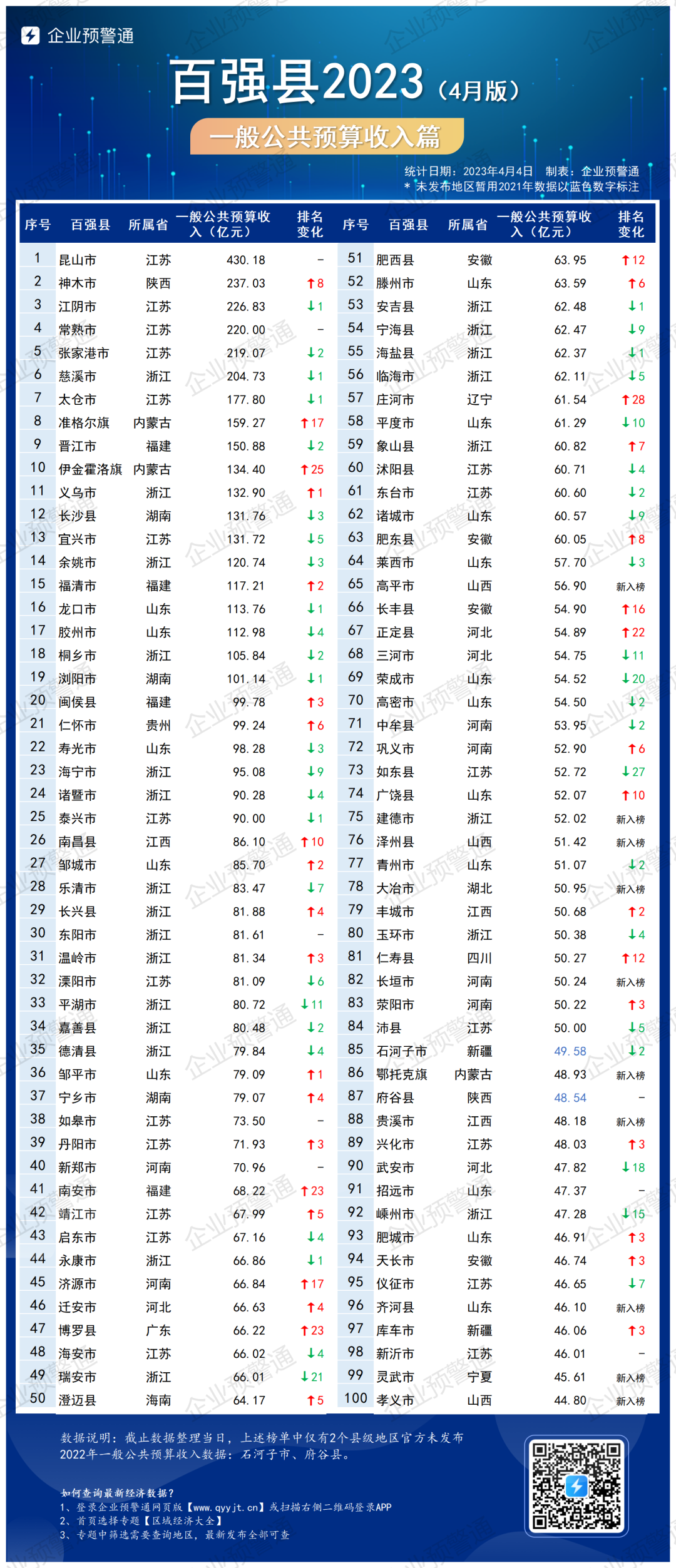据企业预警通数据统计,截至4月4日,全国有1644个县级地区(不含区,下同)披露2022年度GDP和一般公共预算收入数据。