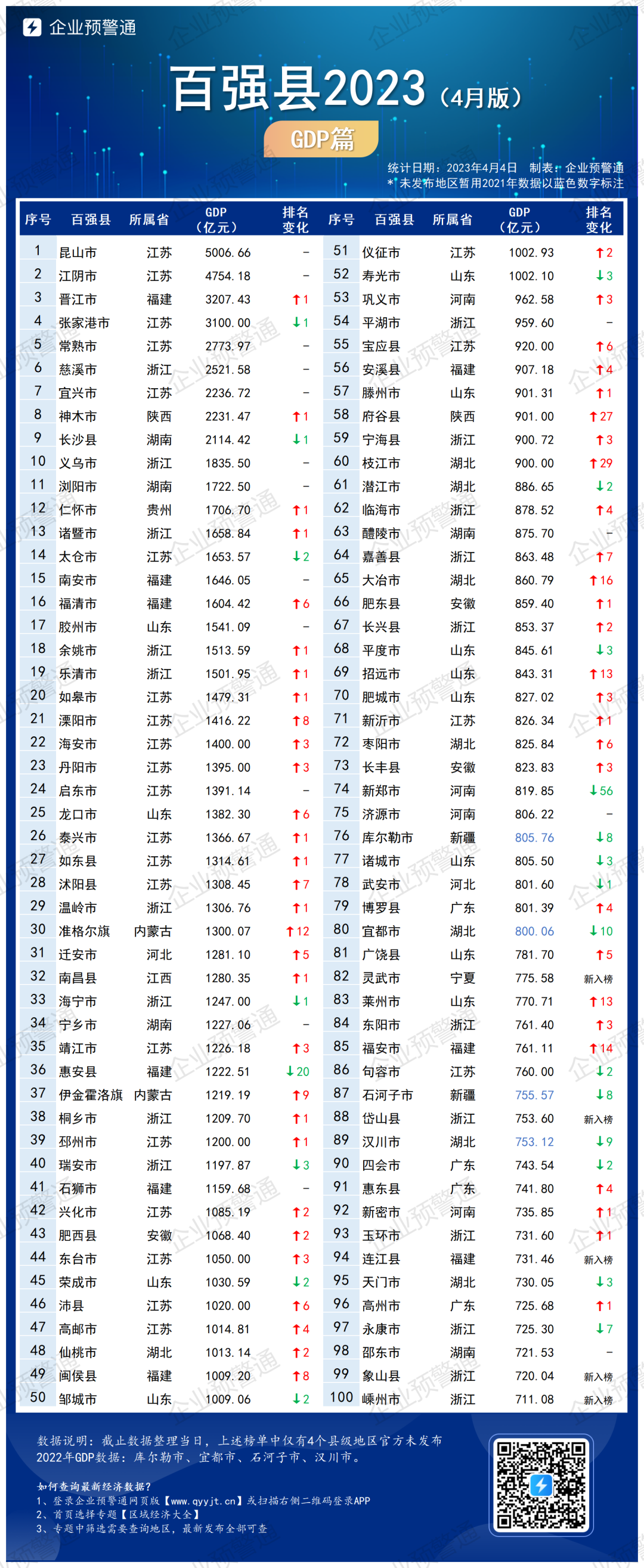 相较3月初统计披露,新增365个县级地区。截至目前,排名较靠前的县级地区已披露完毕,对比2021年度百强县,两个指标仅5个地区暂未发布最新年度数据。