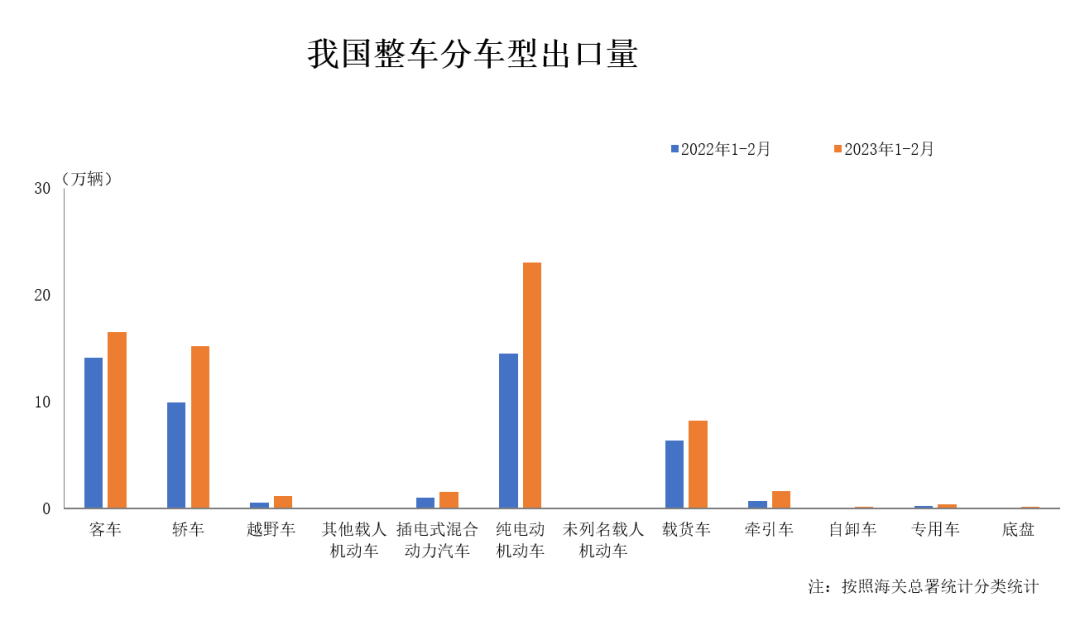 中国汽车工业协会:2023年1-2月我国汽车整车出口情况简析 中国汽车工业协会整理的海关总署数据显示,2023年1-2月,我国汽车整车出口同比保持高速增长。 2023年1-2月,整车出口量同比增长1.4倍;整车出口金额同比增长2.3倍。 2023年1-2月,在汽车主要出口车型中,纯电动机动车(10座及以上客车除外)出口量位居第一,客车居次,轿车位居第三,载货车居第四位,与上年同期相比,上述四大类车型均呈较快增长,其中纯电动机动车增速最为显著。上述四大类品种出口量占整车出口总量的92.3%。 更多阅读:中国汽车工业协会:2023年5月我国汽车整车出口情况简析中国汽车工业协会:2022年12月我国汽车整车出口情况简析中国汽车工业协会:2023年3月我国汽车整车出口情况简析中国汽车工业协会:2022年1-2月我国汽车整车出口情况简析中国汽车工业协会:2023年7月我国汽车整车出口情况简析中国汽车工业协会:2022年1-3月我国汽车整车出口情况简析中国汽车工业协会:2024年6月我国汽车整车出口情况简析中国汽车工业协会:2023年1-2月我国汽车商品出口金额前十国情况简析中国汽车工业协会:2022年3月前十位轿车品牌销量排名中国汽车工业协会:2021年5月汽车工业运行情况简述中汽协:2024年5月中国汽车整车出口情况简析中国汽车工业协会:2023年1-8月汽车制造业工业增加值保持较快增长中国汽车工业协会:2024年5月海关进出口情况简析中国汽车工业协会:2023年1-8月前十位SUV生产企业销售情况简析中国汽车工业协会:2023年1-8月前十位轿车生产企业销售情况简析