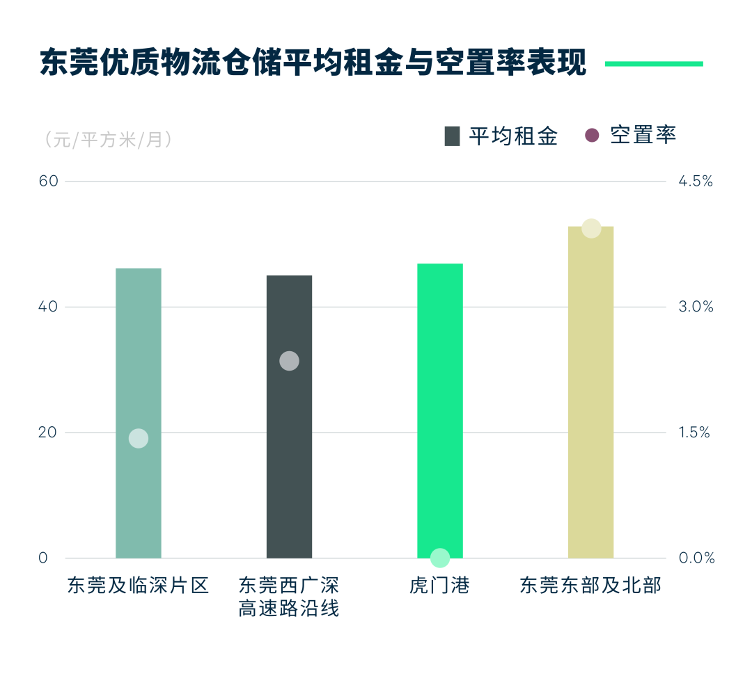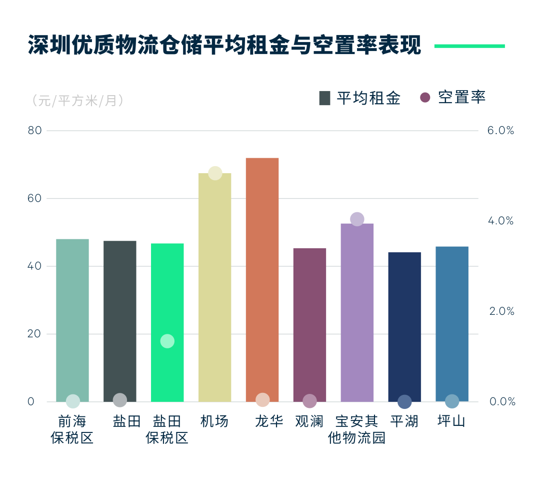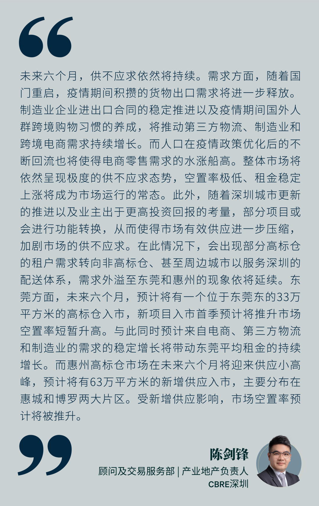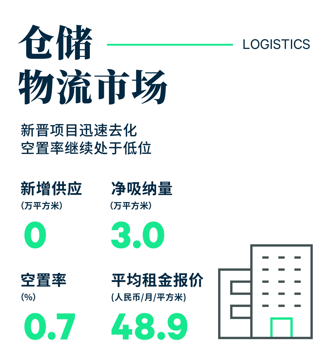 国门开放后物流渠道的畅通令保税仓的出货频率增加,原本在疫情期间囤积的货物得以离岸,带动第三方物流成为本季的主要需求来源。此外,以生物医药和电子产品为主的制造业也为整体市场贡献了不俗的需求。旺盛市场需求带动于上个季度新交付的项目在本季实现了入驻率的大幅提升,并由此带动整体市场空置率环比下降1.1个百分点至0.7%的极低水平,整体市场依然呈现极度的供不应求。租金方面,极度供不应求推动市场平均租金保持稳定增长,环比增长0.6%至每月每平方米48.9元。