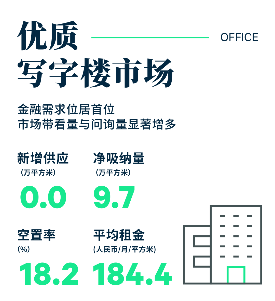 租金方面,在租赁需求回暖实地落地前,业主依然延续2022年的租赁优惠策略,令全市平均租金环比小幅下跌0.2%至每月每平方米184.4元。但与此同时,市场有监测到少量租金增长的项目案例,释放了市场复苏的积极信号。