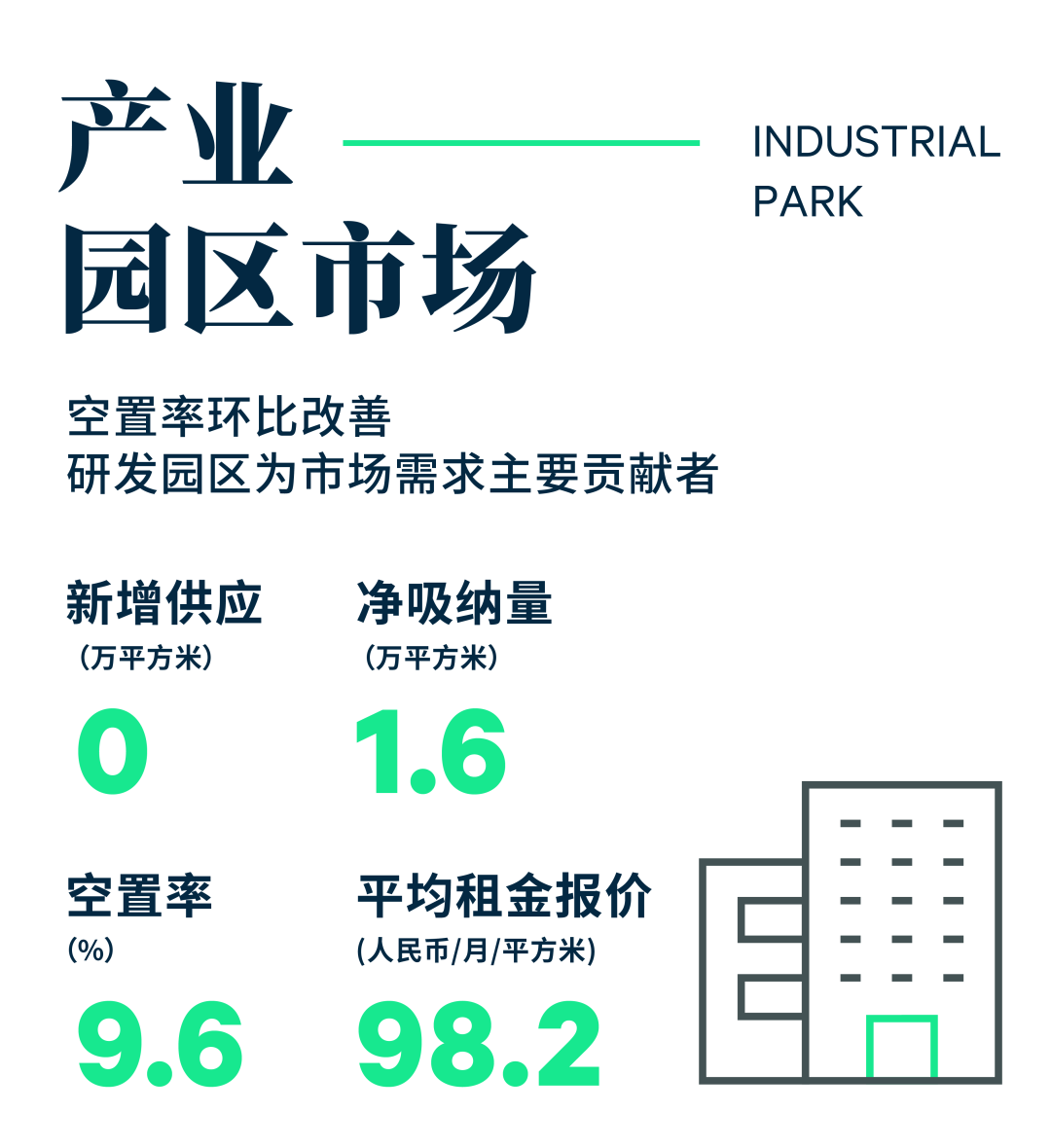 深圳优质产业园市场单季共录得1.6万平方米的净吸纳量,同比及环比均有所减少。因无新增供应入市,在需求带动下,整体市场空置率环比下降0.3个百分点至9.6%。