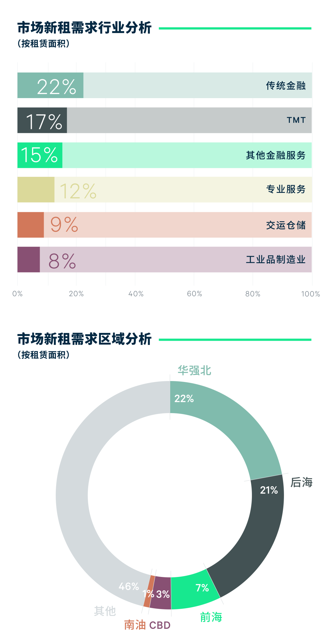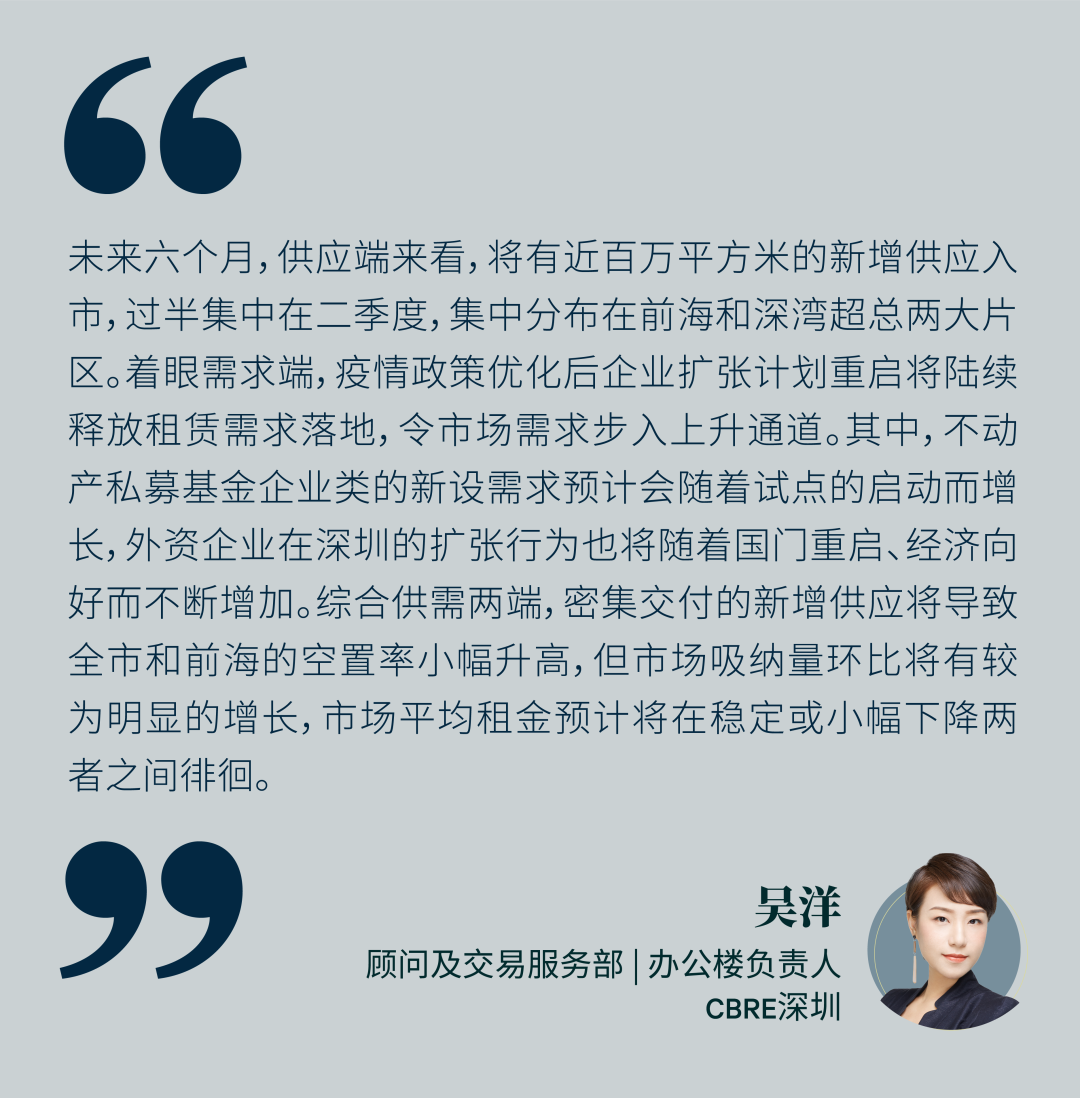 搬迁需求依然主导市场,占比为67%,其中约4成来自升级搬迁。新设立需求在本季录得明显上升,占比为22%,主要来自外地来深的律所、疫情后回归的留学教育类以及外地来深发展的金融企业的扩张。本地企业依然是需求主力,占比超6成,在国内企业在深扩张步伐加快的情况下,国内企业需求占比环比提升7个百分点至29.9%。本季华强北和后海片区为全市贡献了主要的吸纳量,主要来自科技及电子企业的新租和扩租推动。