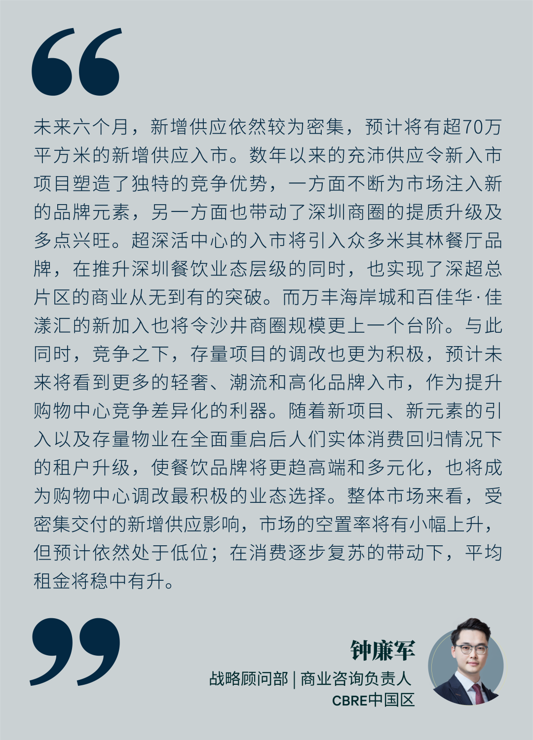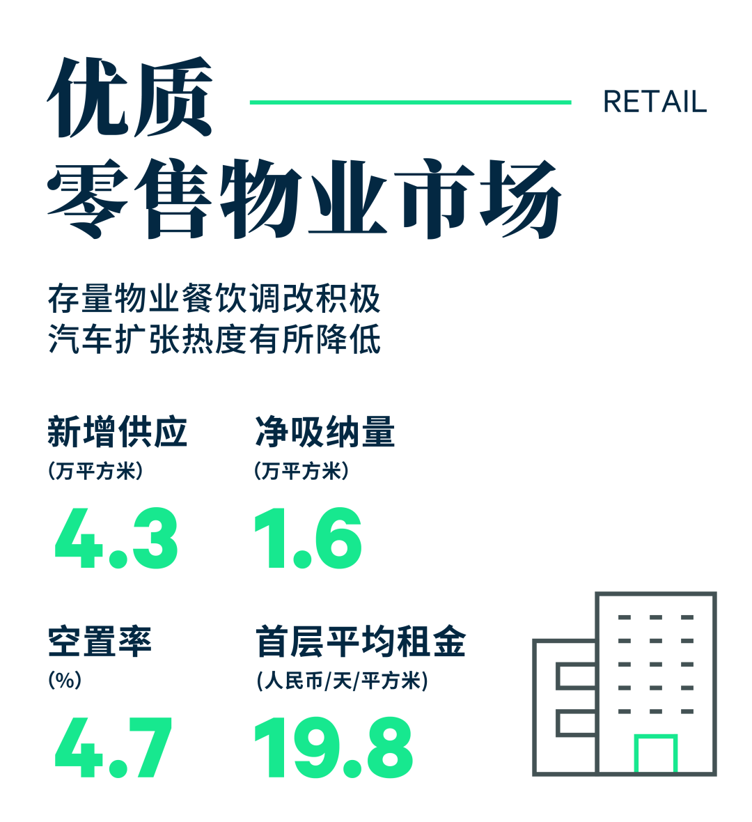 随着全面重启后线下消费的逐步回归,业主市场信心不断增强,市场平均租金在本季实现了止跌回稳,平均租金保持在每天每平方米19.8元。