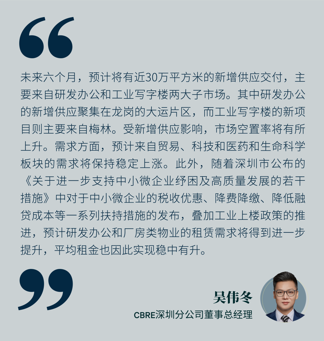 需求主要贡献自研发园区,以深圳本地企业搬迁为主,主要来自零售贸易、科技及专业服务,需求占比分别为41.9%、11.7%和5.9%。其中零售贸易需求以电子产品贸易企业为主,而科技细分需求聚焦于软件与信息服务板块,专业服务则以企业管理类的咨询公司租赁居多。与此同时,工业写字楼也录得了少量去化,以科技和专业服务业需求为主,其中科技板块以36.4%的占比位居首位,软件开发及律所类企业扩张活跃。而厂房子市场的需求则主要源自电子产品和充电桩制造企业的扩张。