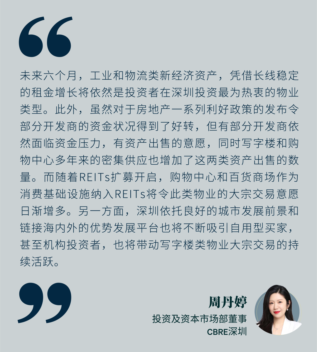 市场参与主体方面,季内的卖家以大型的开发商为主,包括华润、华侨城和佳兆业,主要通过出售存量和增量物业来实现资金回笼。而从买方来看,企业买家依然是主力军,写字楼的自用买家主要来自于本地与外地的科技公司。