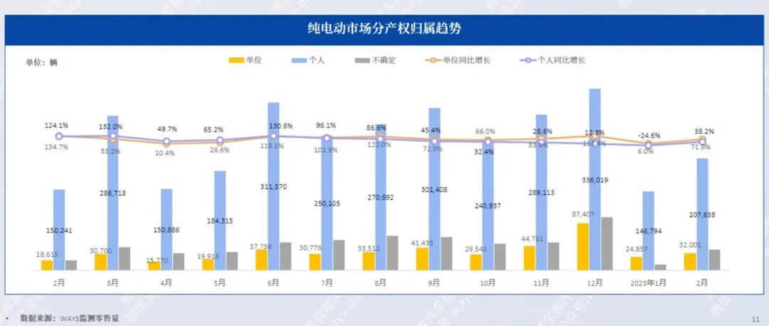 2月,纯电动市场个人用户占比为74.6%,同比增长38.2%;单位用户占比11.5%,同比增长71.9%。 -