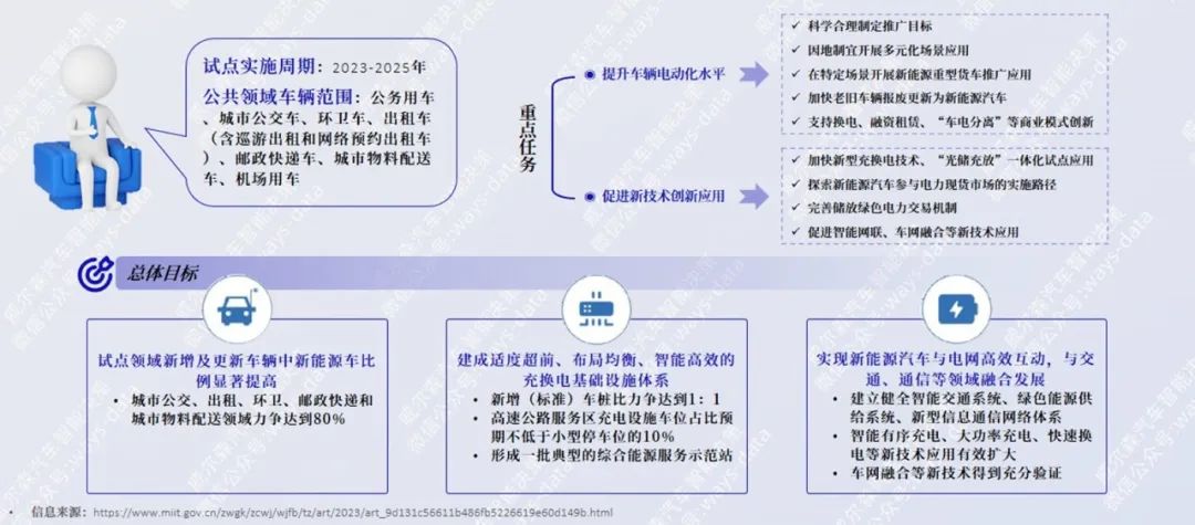 - 2023年2月3日,工信部、交通部、发改委、财政部、生态环境部、住建部、能源局和邮政局联合发布《关于组织开展公共领域车辆全面电动化先行区试点工作的通知》,推动提升公共领域车辆电动化水平,加快建设绿色低碳交通运输体系。