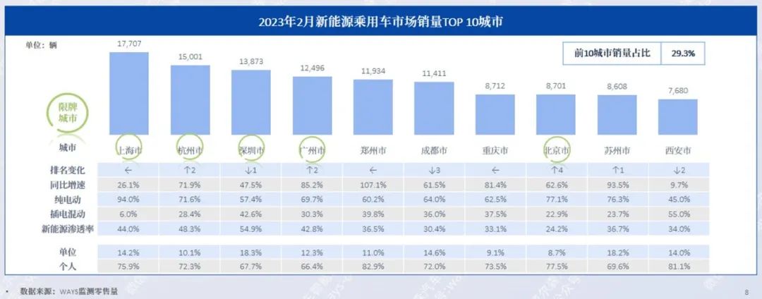 2月,前10城市销量占比为29.3%,比上月(29.5%)微降0.2%;前3城市分别是:上海市、杭州市、深圳市;其中同比涨幅最大的城市为郑州市(107.1%);北京市同比增长62.6%,排名上升4位进入前十。