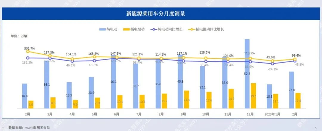 2月,纯电动销量约27.8万辆,同比上涨48.3%,环比上涨52.3%;插电混动销量约11.8万辆,同比上涨99.6%,环比上涨6.2%。