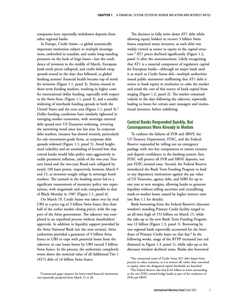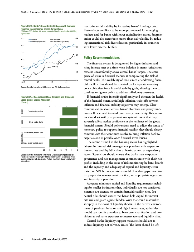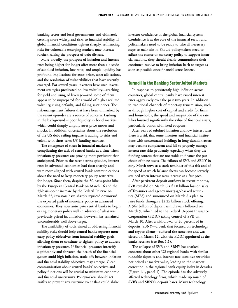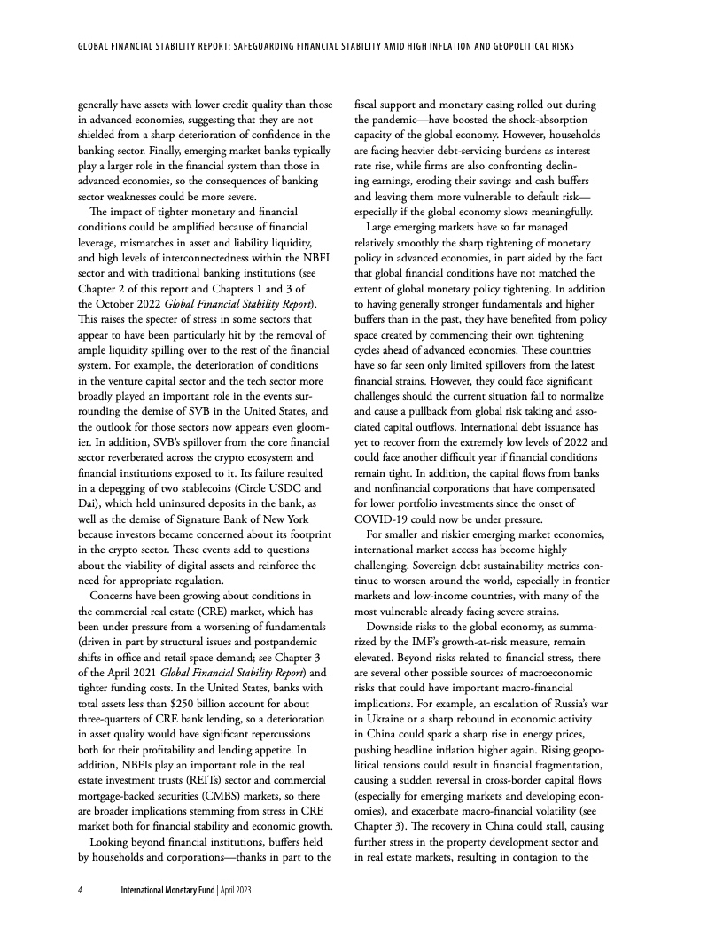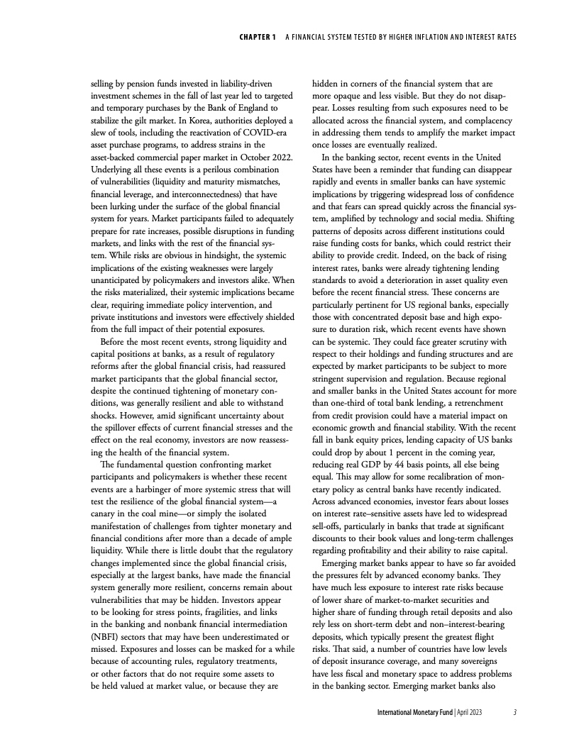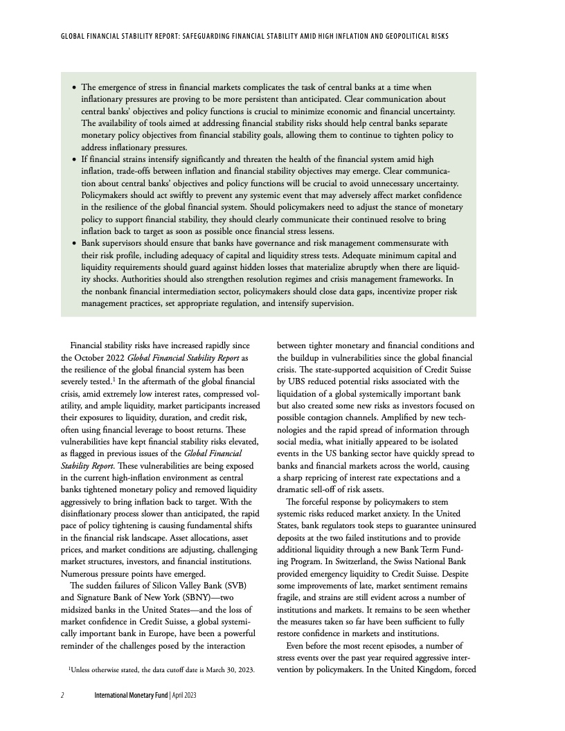 IMF拥有评估全球金融稳定的职能。其指出,金融机构的监管和处置都存在着不足。此前的《全球金融稳定报告》曾警告称,当利率上升时,银行和非银行金融中介机构将面临压力。