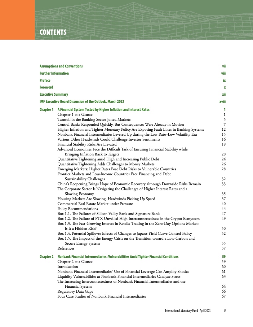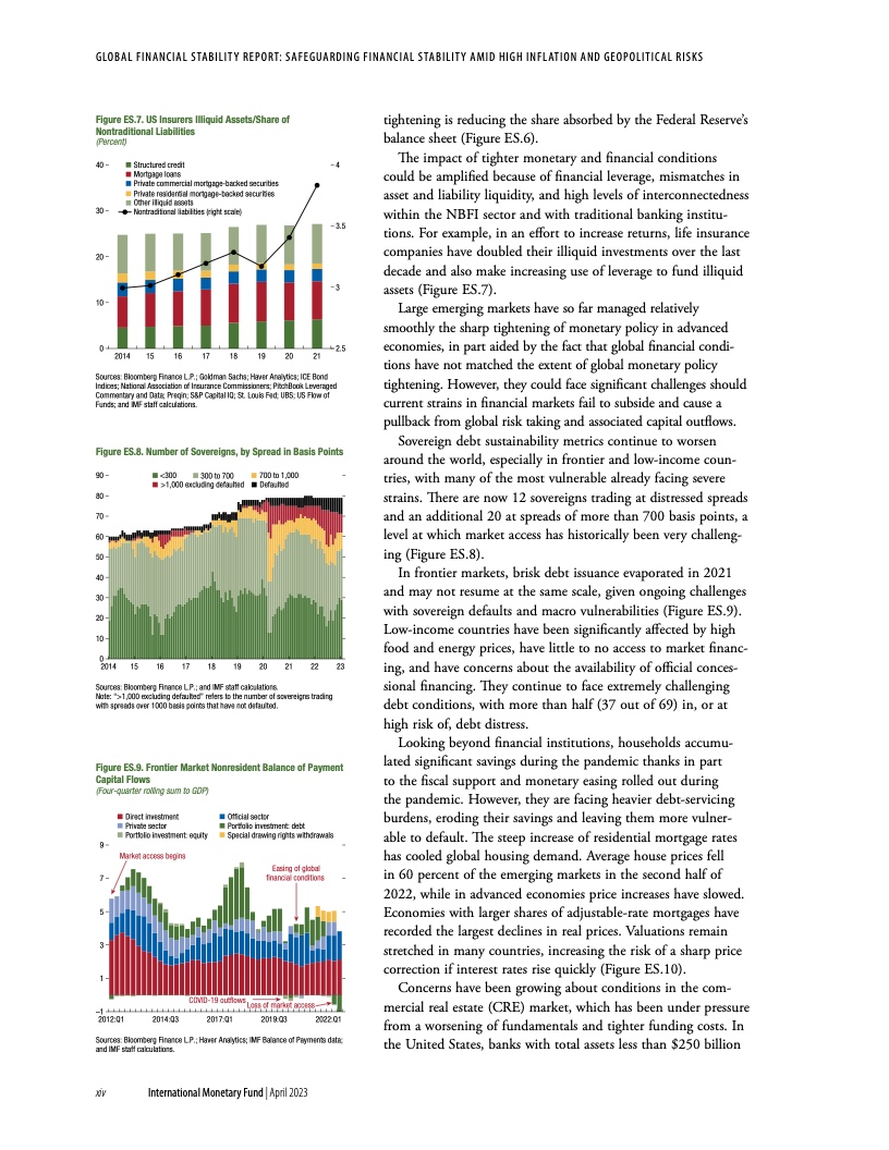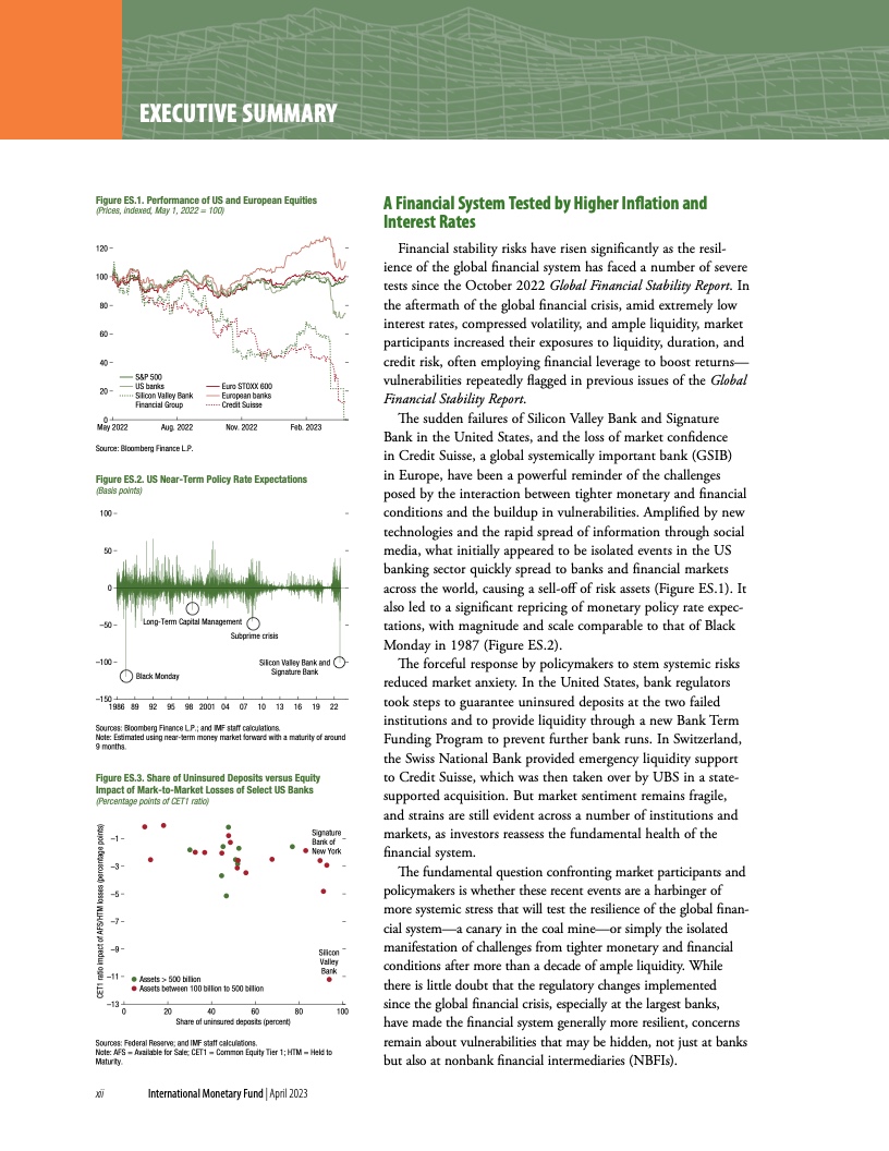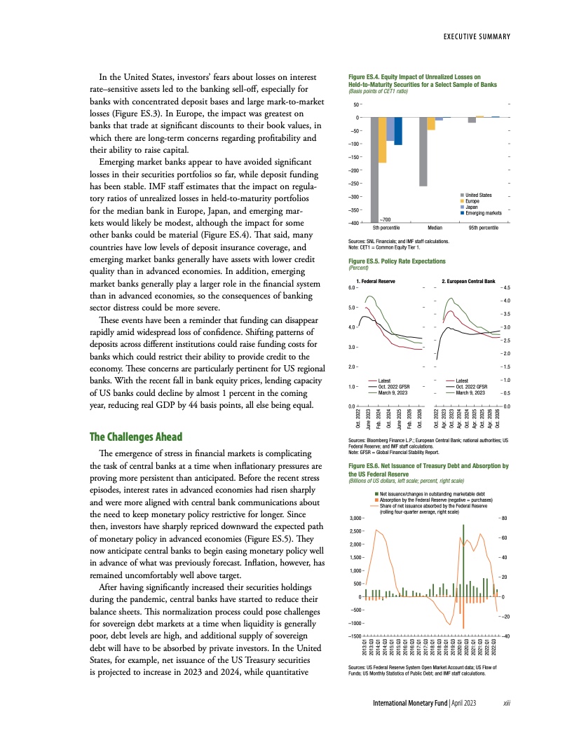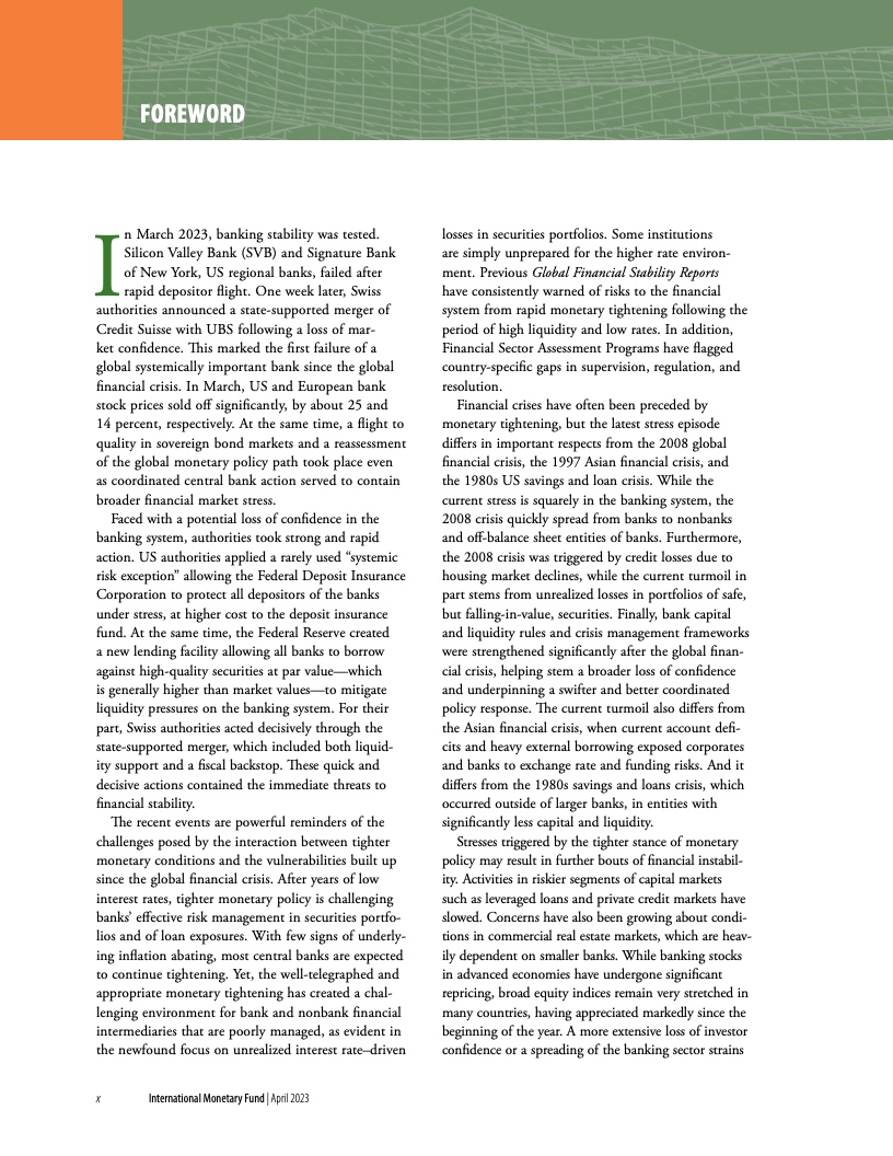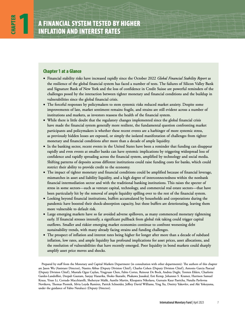 IMF拥有评估全球金融稳定的职能。其指出,金融机构的监管和处置都存在着不足。此前的《全球金融稳定报告》曾警告称,当利率上升时,银行和非银行金融中介机构将面临压力。